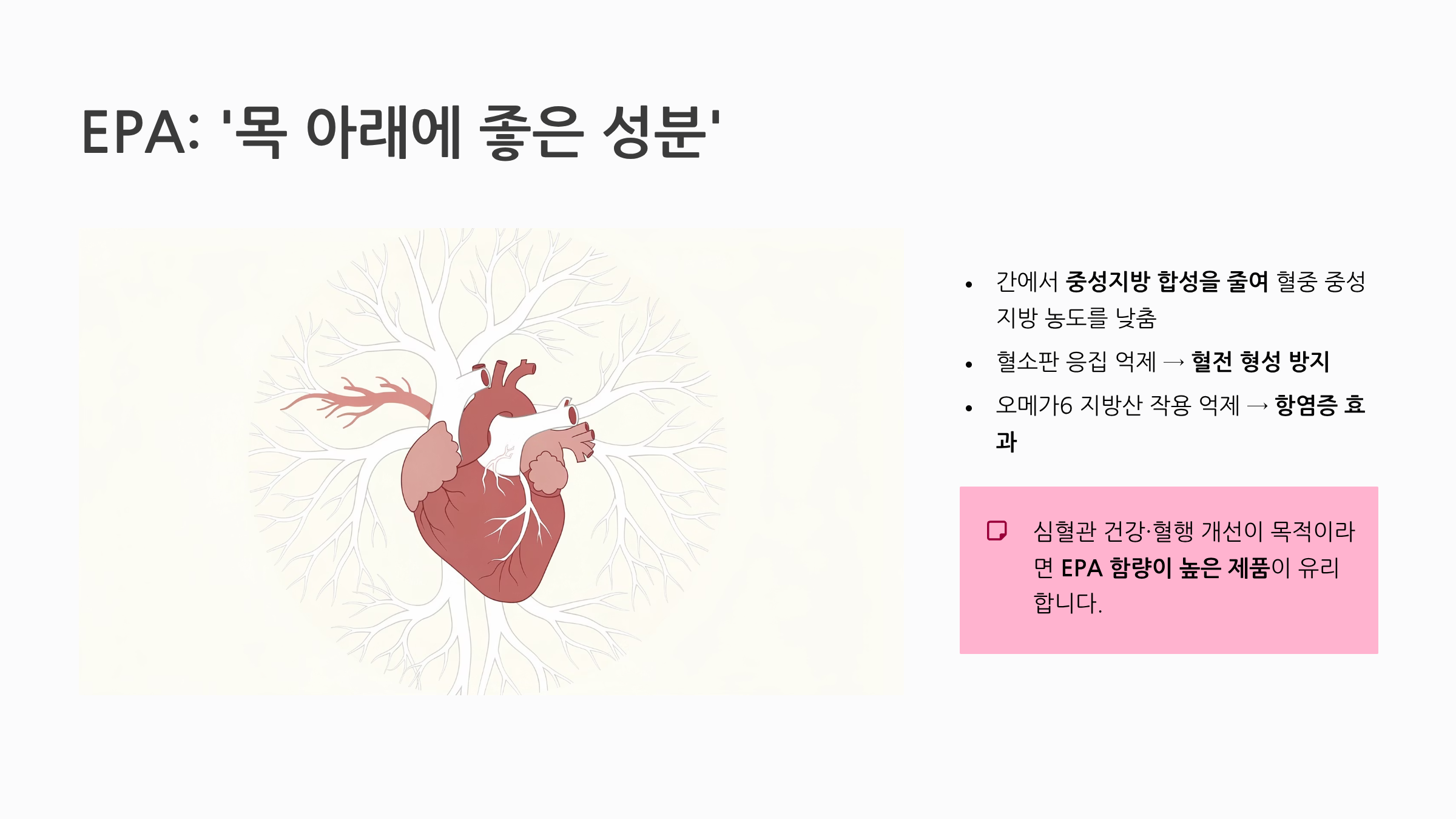 EPA는 흔히 '목 아래에 좋은 성분'으로 불립니다. 간에서 중성지방 합성을 줄여 혈중 중성지방 농도를 낮추고, 혈소판 응집을 억제해 혈전 형성을 막는 역할을 합니다. 염증 반응을 유발하는 오메가6 지방산의 작용을 억제해 항염증 효과도 냅니다. 심혈관 건강, 혈행 개선이 주된 목적이라면 EPA 함량이 높은 제품이 유리합니다.