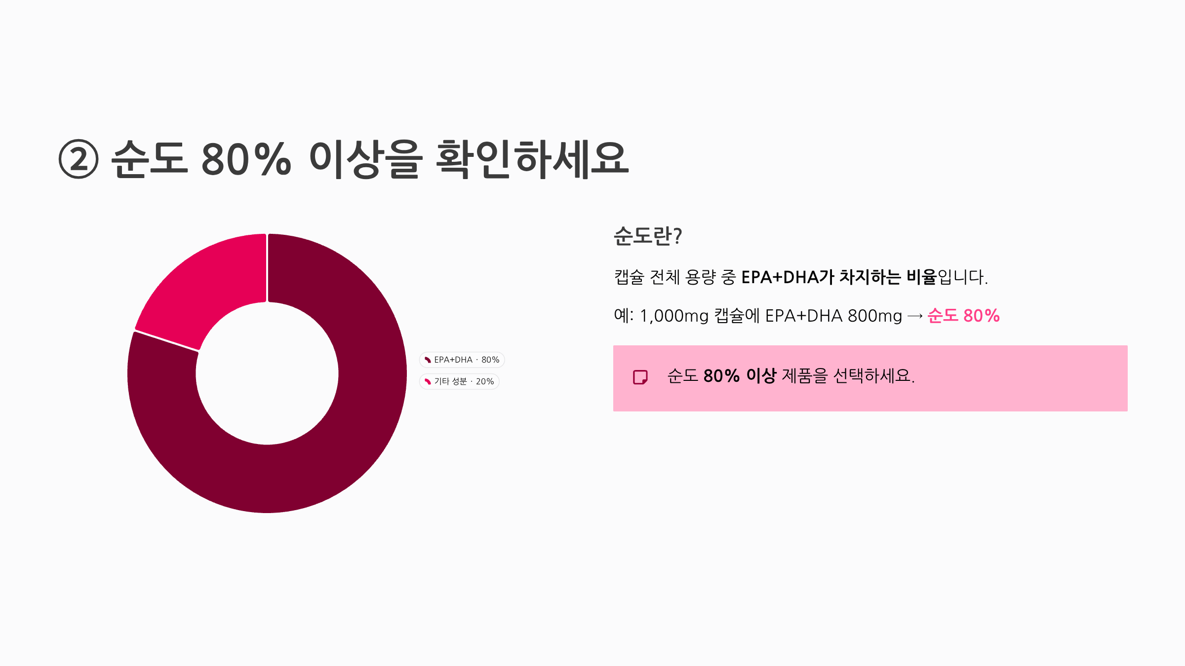 두 번째는 순도를 확인하는 것입니다. 캡슐 전체 용량 중 EPA+DHA가 차지하는 비율이 순도입니다. 예를 들어 1,000mg 캡슐에 EPA+DHA가 800mg 들어있다면 순도 80%입니다. 순도 80% 이상인 제품을 선택하는 것이 좋습니다.
