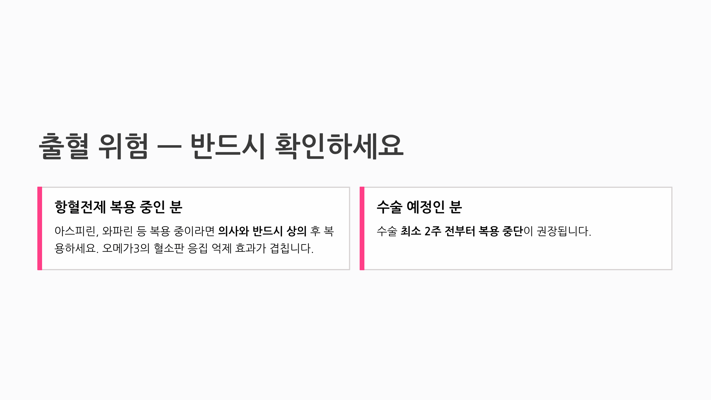 오메가3는 비교적 안전한 영양제지만, 일부 상황에서는 주의가 필요합니다.
