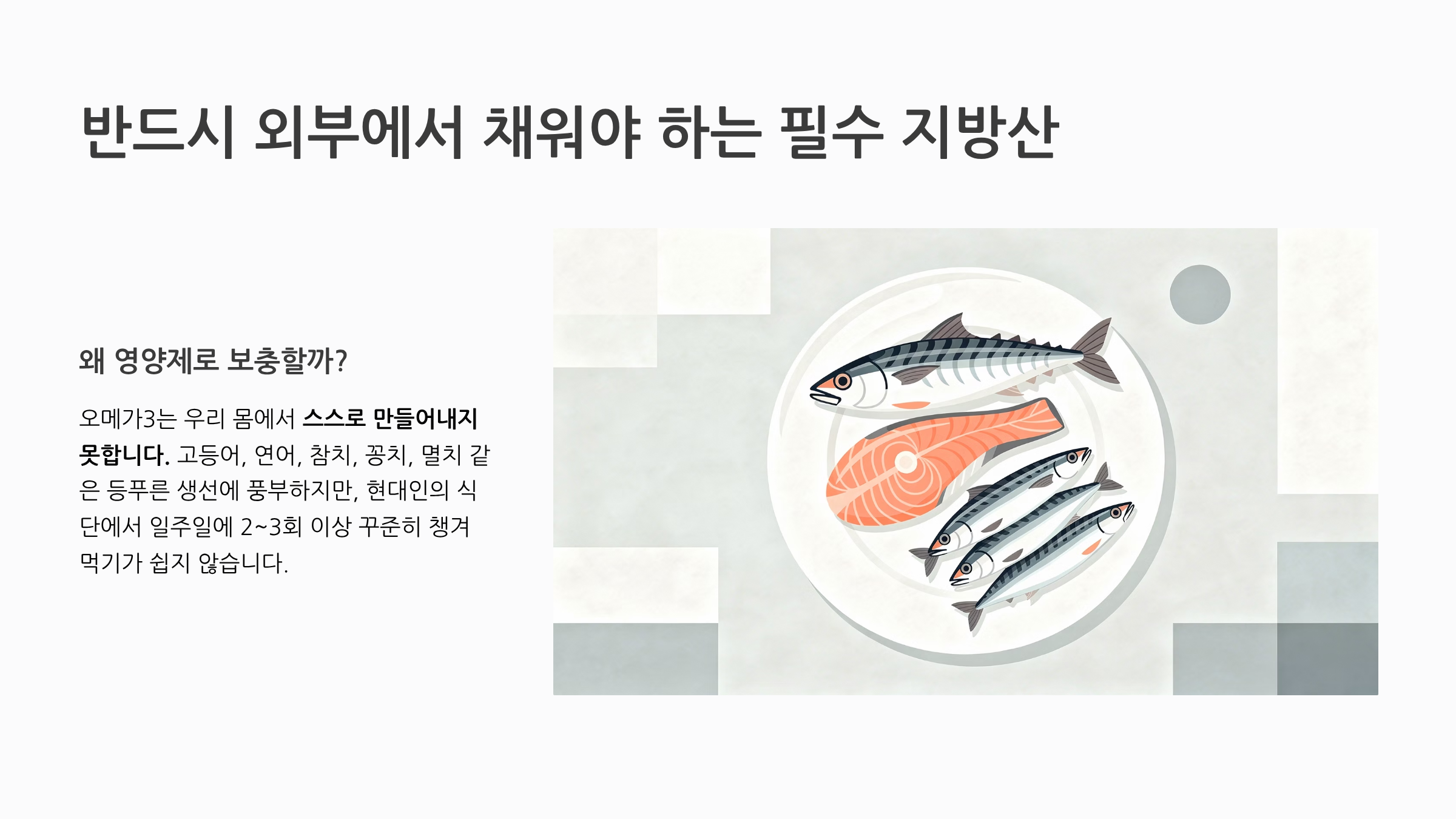 중요한 점은 오메가3는 우리 몸에서 스스로 만들어내지 못한다는 것입니다. 반드시 음식이나 영양제로 외부에서 채워야 하는 필수 지방산입니다. EPA와 DHA는 주로 고등어, 연어, 참치, 꽁치, 멸치 같은 등푸른 생선에 풍부하게 들어 있는데요. 현대인의 식단에서 이런 생선을 일주일에 2~3회 이상 꾸준히 챙겨 먹기가 쉽지 않기 때문에 영양제로 보충하는 분들이 많습니다.