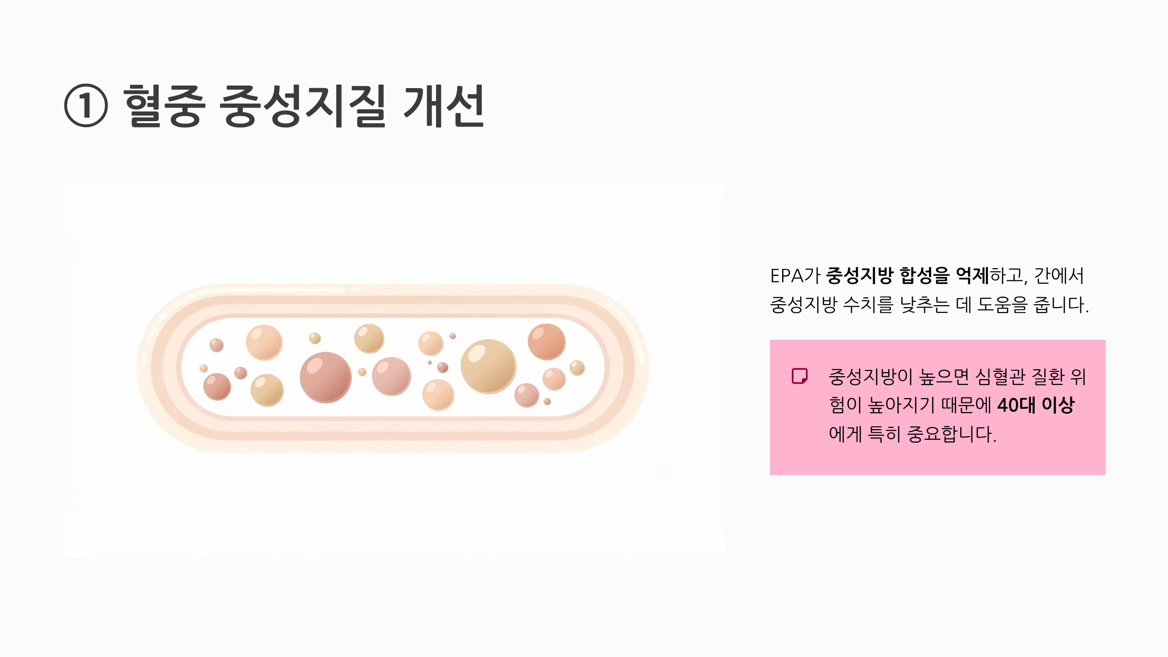 첫째, 혈중 중성지질 개선입니다. EPA가 중성지방 합성을 억제하고, 간에서 중성지방 수치를 낮추는 데 도움을 줍니다. 중성지방이 높으면 심혈관 질환 위험이 높아지기 때문에 40대 이상 특히 중요합니다. 둘째, 혈행 개선입니다. 혈액의 응고를 억제해 혈액이 끈적끈적해지는 것을 막고 혈액 순환을 원활하게 돕습니다. 셋째, 기억력 개선입니다. DHA가 뇌세포를 손상시키는 물질을 줄이고 신경전달 기능을 개선해 기억력 유지에 기여합니다. 넷째, 건조한 눈 증상 개선입니다. DHA가 눈의 망막과 각막 세포막 구성 성분으로 작용하고, 눈물막을 안정시켜 안구건조 증상 완화에 도움이 됩니다.