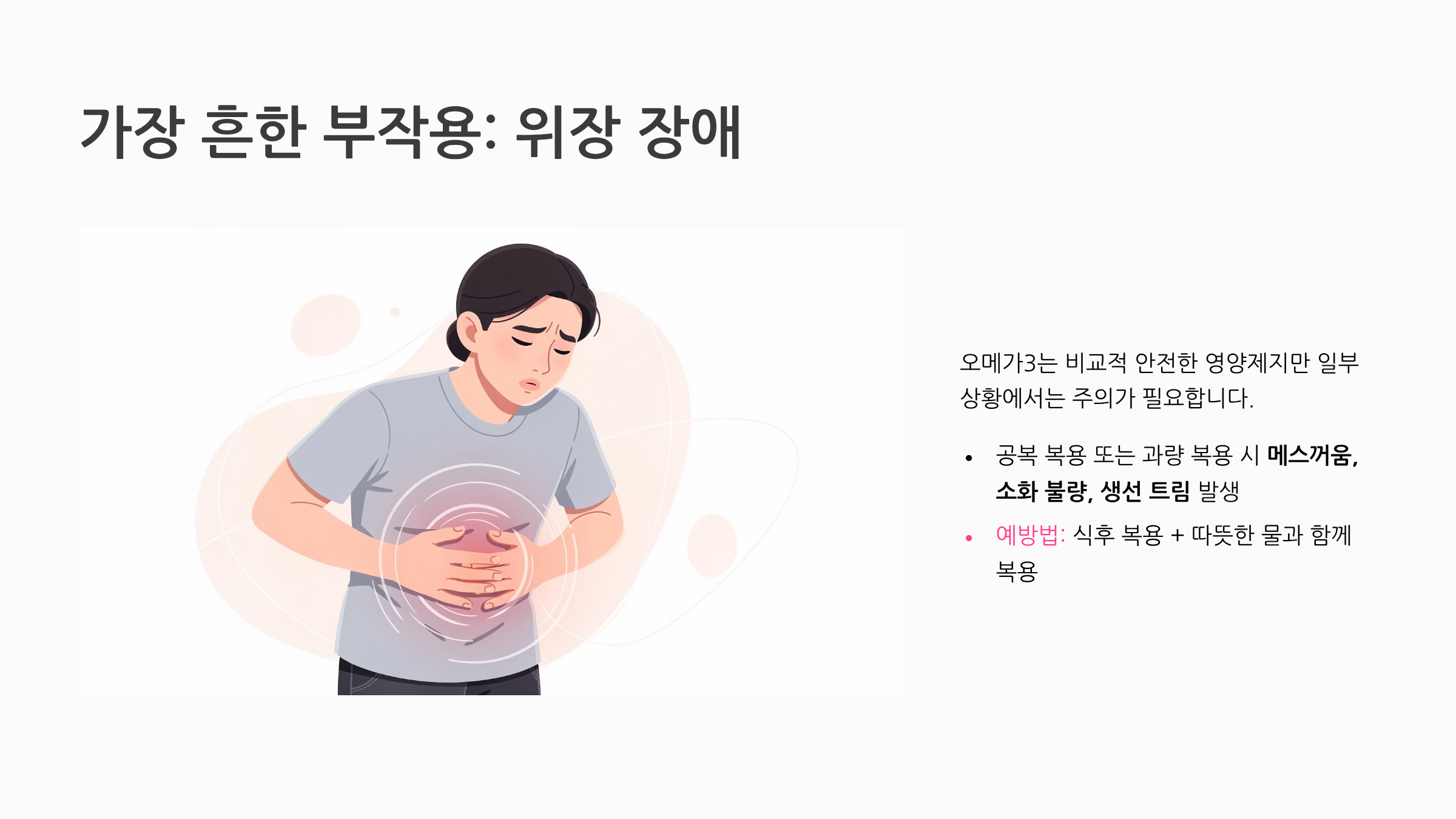가장 흔한 부작용은 위장 장애입니다. 공복에 복용하거나 과량 복용 시 메스꺼움, 소화 불량, 생선 트림이 올라오는 증상이 나타날 수 있습니다. 식후 복용과 따뜻한 물을 함께 마시는 것으로 상당 부분 예방할 수 있습니다.