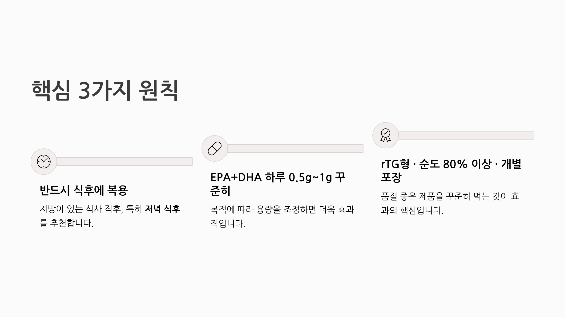 오메가3의 핵심은 세 가지입니다. 반드시 식후에 먹을 것, 지방이 있는 식사 직후가 가장 좋으며 저녁 식후를 추천합니다. EPA+DHA 합계 기준 하루 0.5g~1g을 꾸준히 복용할 것, 단 목적에 따라 용량을 조정하면 더 좋습니다. 그리고 rTG형·순도 80% 이상·개별 포장 제품을 고를 것, 품질 좋은 제품을 꾸준히 먹는 것이 효과의 핵심입니다.
