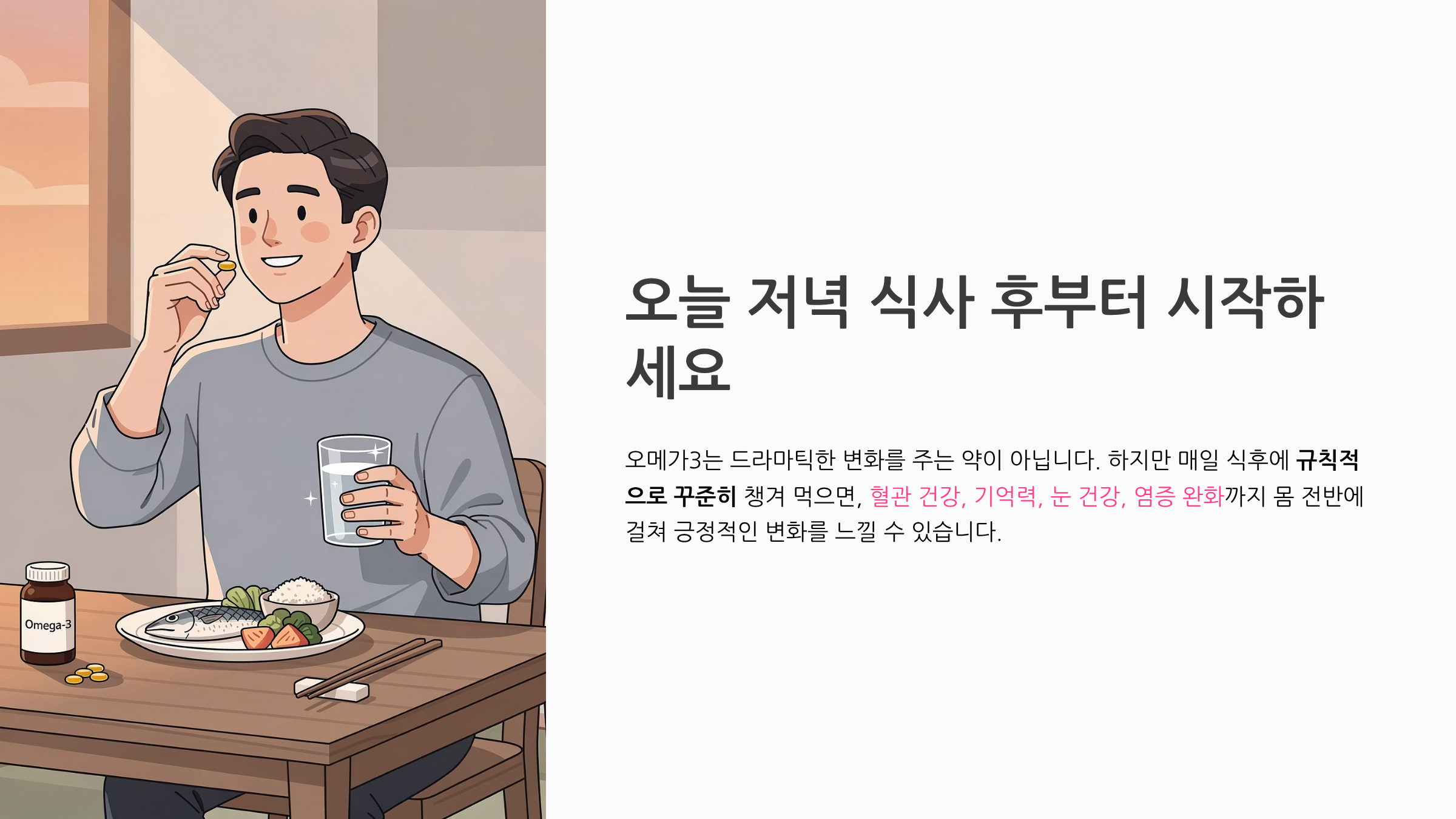 오메가3는 한 알로 드라마틱한 변화를 주는 약이 아닙니다. 하지만 매일 식후에 규칙적으로 꾸준히 챙겨 먹으면, 혈관 건강, 기억력, 눈 건강, 염증 완화까지 몸 전반에 걸쳐 긍정적인 변화를 느낄 수 있습니다. 오늘 저녁 식사 후부터 루틴을 시작해보세요.