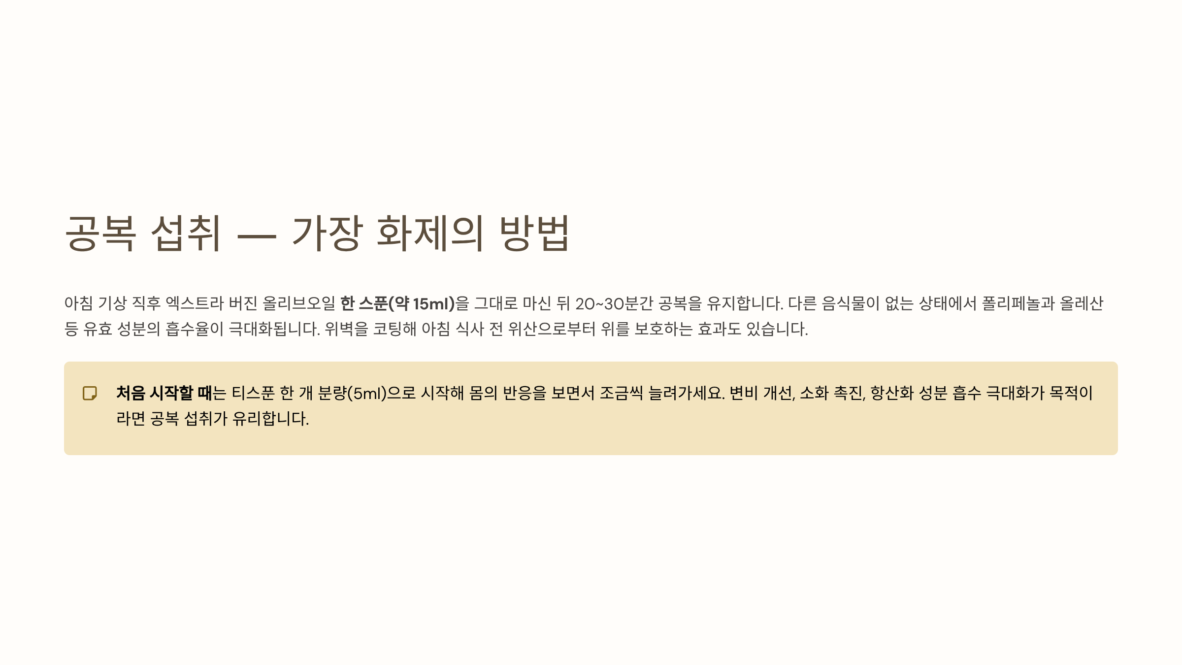 공복 섭취가 가장 화제가 되고 있는 방법입니다. 아침 기상 직후 엑스트라 버진 올리브오일 한 스푼(약 15ml)을 그대로 마신 뒤 20~30분간 공복을 유지하는 방법입니다. 다른 음식물이 없는 상태에서 폴리페놀과 올레산 등 유효 성분의 흡수율이 극대화됩니다. 위벽을 코팅해 아침 식사 전 위산으로부터 위를 보호하는 효과도 있습니다. 변비 개선, 소화 촉진, 항산화 성분 흡수 극대화가 주된 목적이라면 공복 섭취가 유리합니다. 단, 처음에는 티스푼 한 개 분량(5ml)으로 시작해 몸의 반응을 보면서 조금씩 늘려가세요.