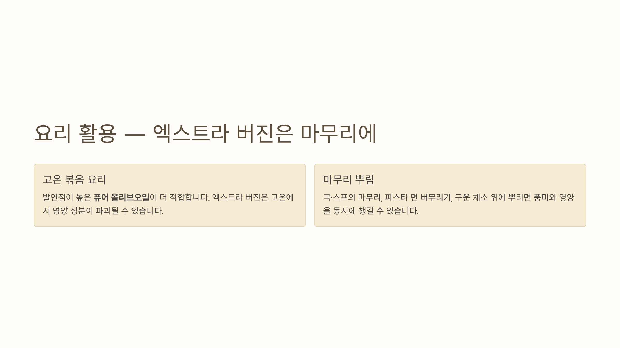 요리 활용 시에는 엑스트라 버진보다 퓨어 올리브오일이 더 적합합니다. 엑스트라 버진은 발연점이 상대적으로 낮아 고온 볶음보다는 낮은 온도의 조리나 마무리 뿌림에 사용하는 것이 좋습니다. 국, 스프의 마무리에 한 바퀴 두르거나, 파스타 면에 가볍게 버무리거나, 구운 채소에 뿌리면 풍미도 살리고 영양도 챙길 수 있습니다.