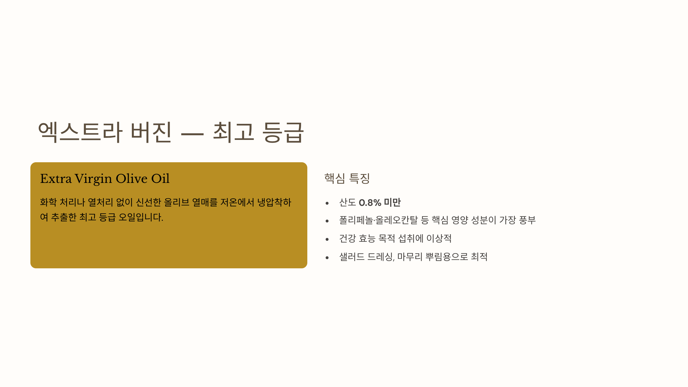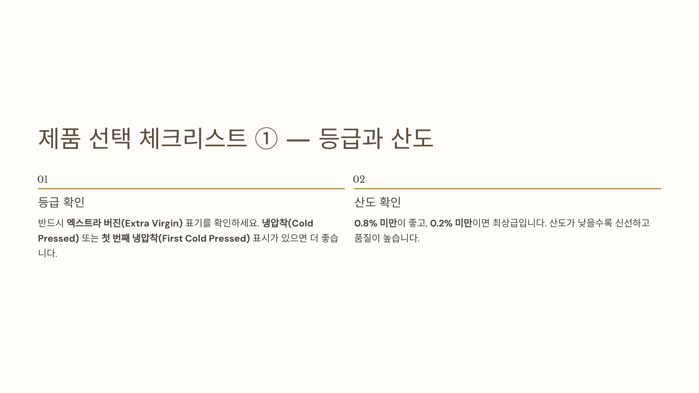 제품 선택 시 첫 번째로 확인할 것은 등급입니다. 반드시 엑스트라 버진(Extra Virgin) 표기를 확인하세요. 냉압착(Cold Pressed) 또는 첫 번째 냉압착(First Cold Pressed) 표시가 있으면 더 좋습니다. 두 번째는 산도입니다. 0.8% 미만이 좋고 0.2% 미만이면 최상급입니다.