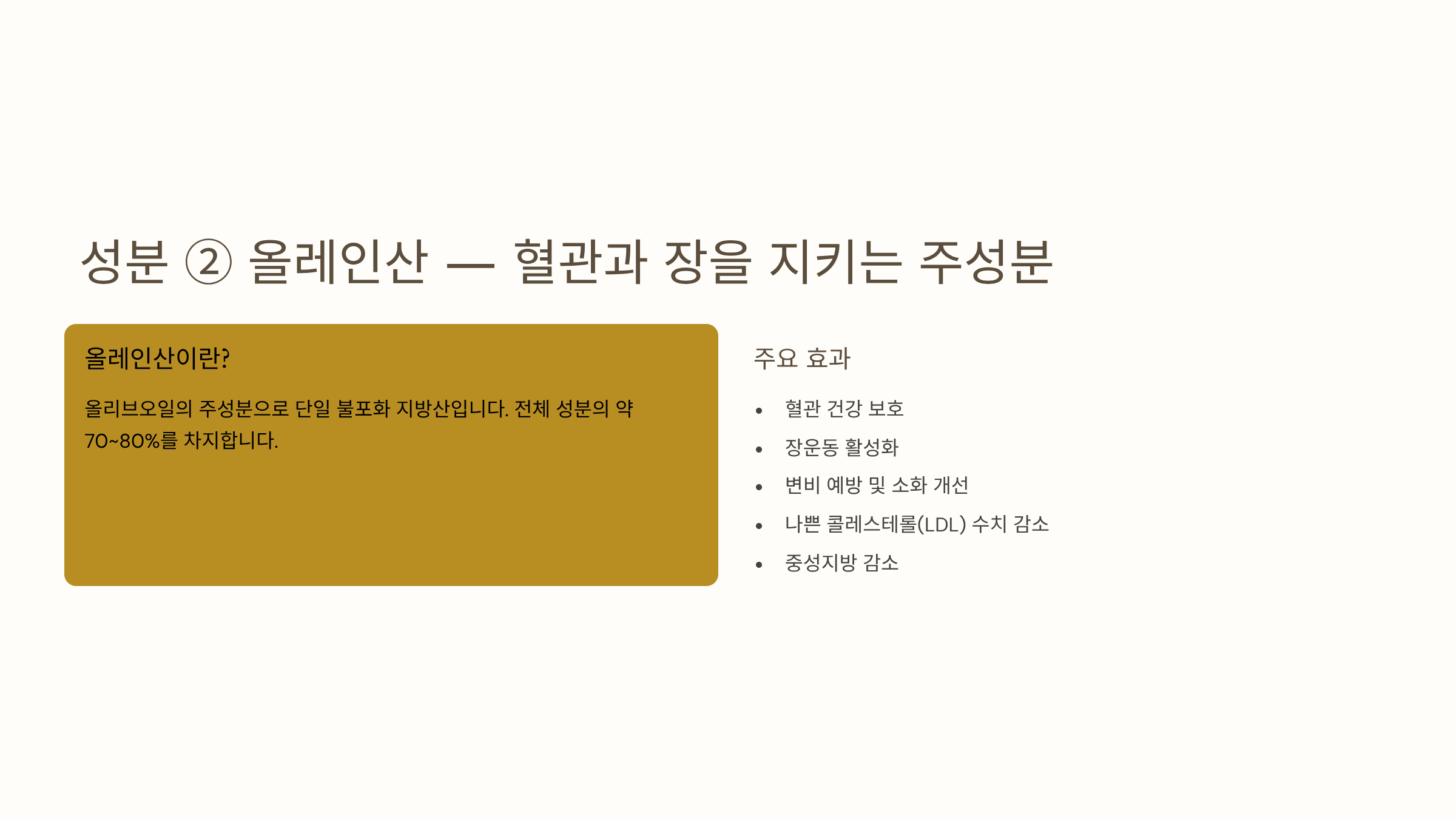 두 번째는 올레인산(Oleic Acid)입니다. 올리브오일의 주성분으로 단일 불포화 지방산입니다. 혈관 건강을 지키고 장운동을 활발하게 하며 변비 예방과 소화 개선에 효과적입니다. 나쁜 콜레스테롤 수치를 낮추고 중성지방을 감소시키는 역할도 합니다.