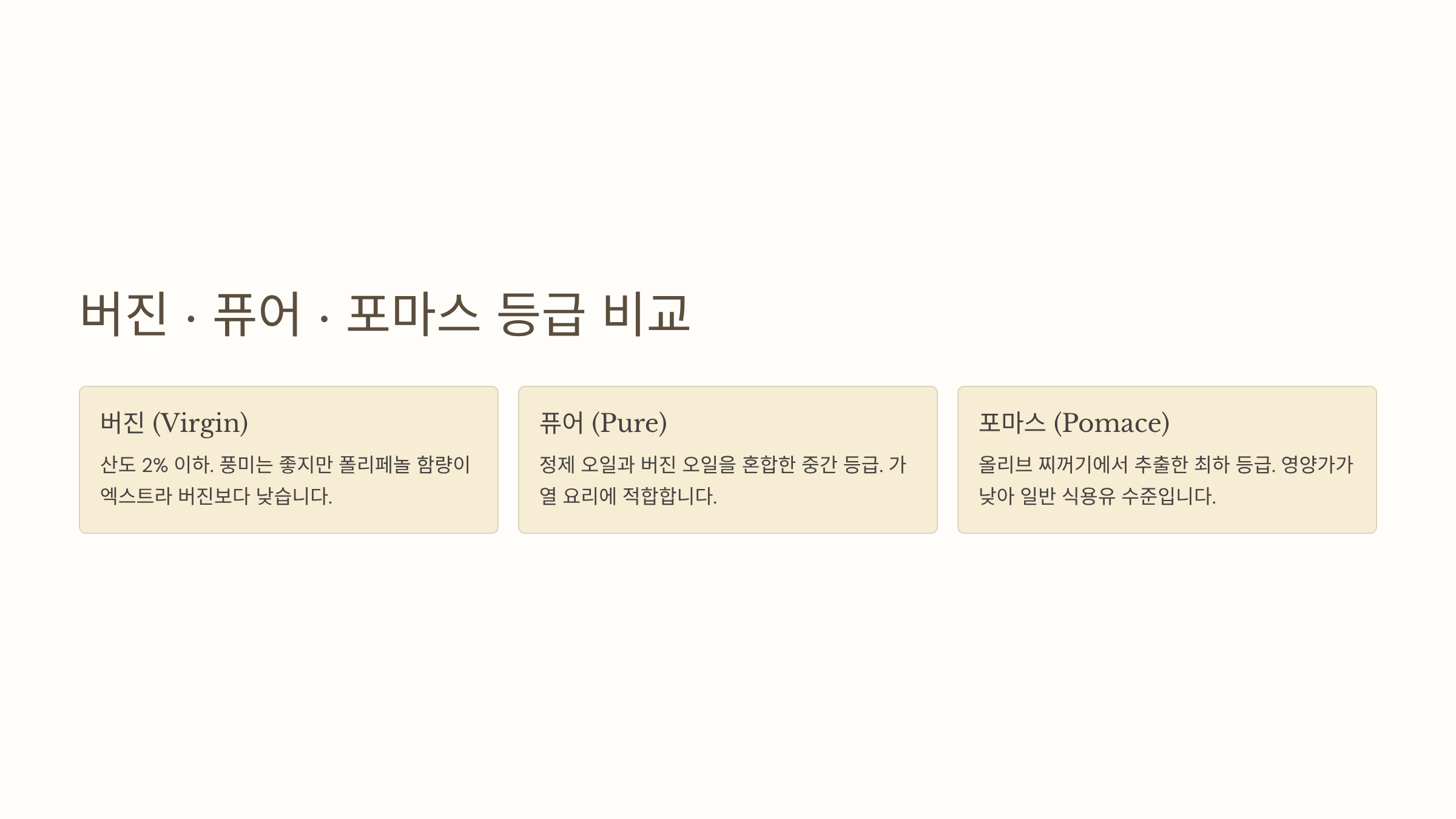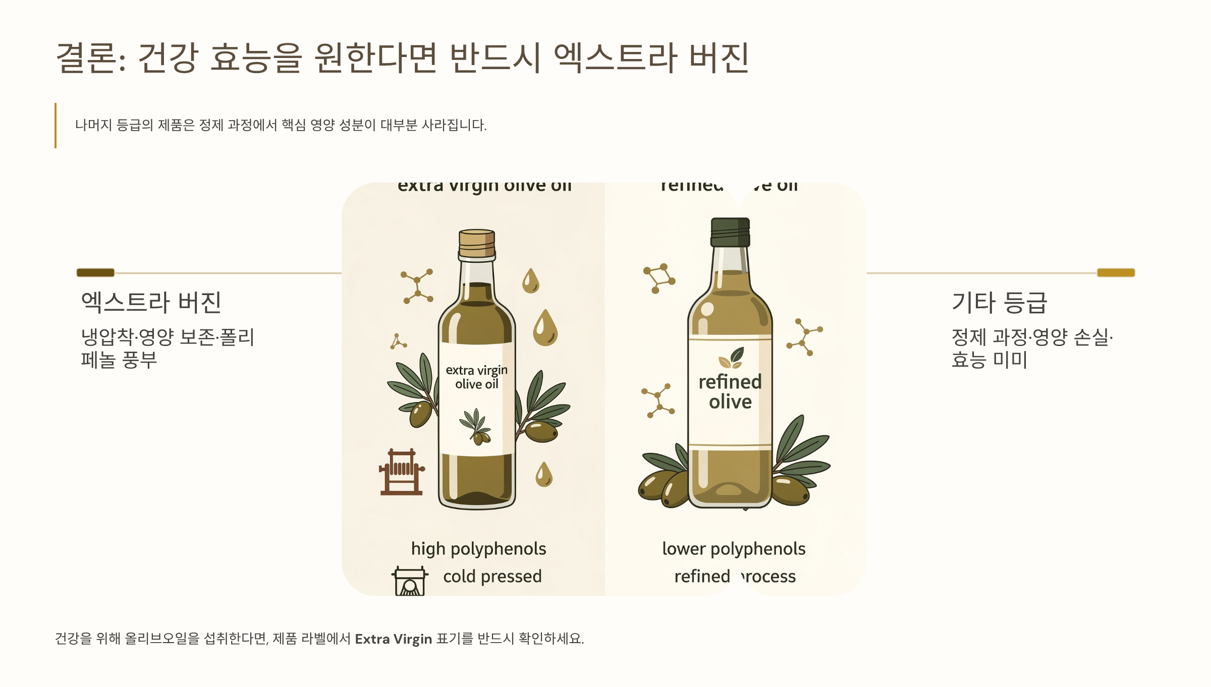 결론적으로 건강 효능을 원한다면 반드시 엑스트라 버진(Extra Virgin)을 선택해야 합니다. 나머지 등급의 제품은 정제 과정에서 핵심 영양 성분이 대부분 사라집니다.