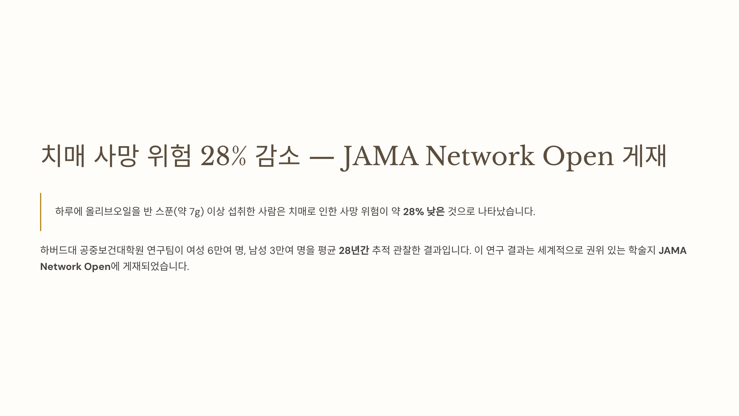 하버드대 공중보건대학원 연구팀이 여성 6만여 명, 남성 3만여 명을 평균 28년간 추적 관찰한 결과, 하루에 올리브오일을 반 스푼(약 7g) 이상 섭취한 사람은 치매로 인한 사망 위험이 약 28% 낮은 것으로 나타났습니다. 이 연구 결과는 세계적으로 권위 있는 학술지 JAMA Network Open에 게재되었습니다.