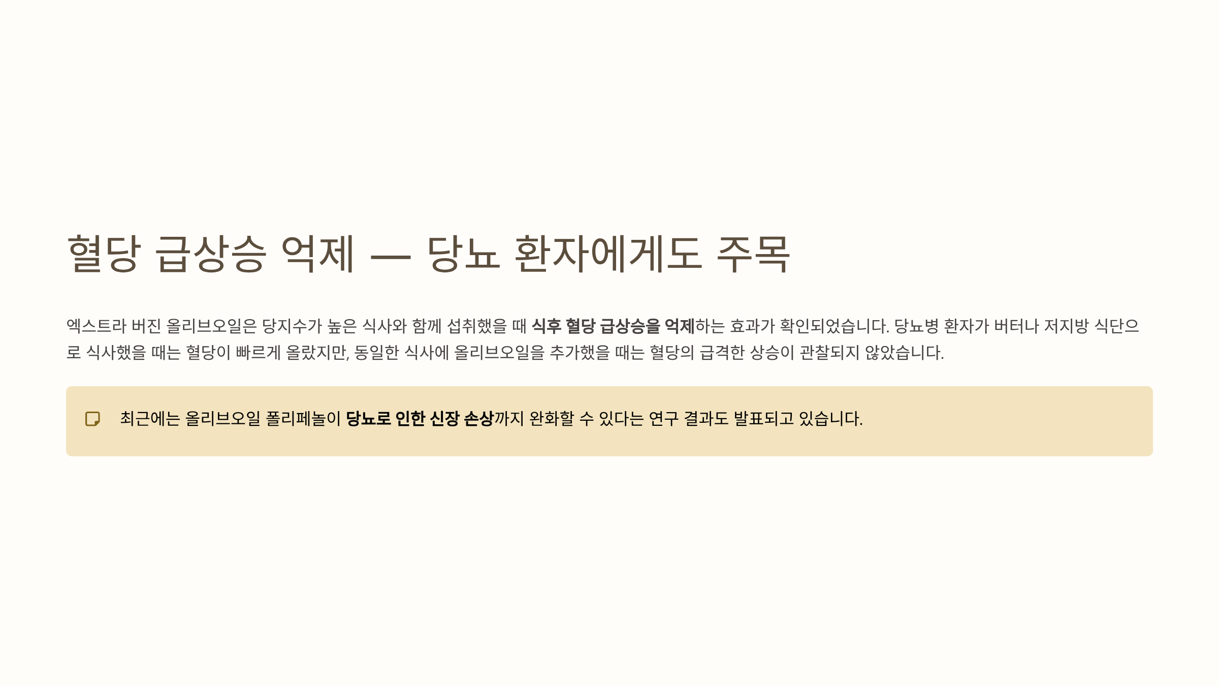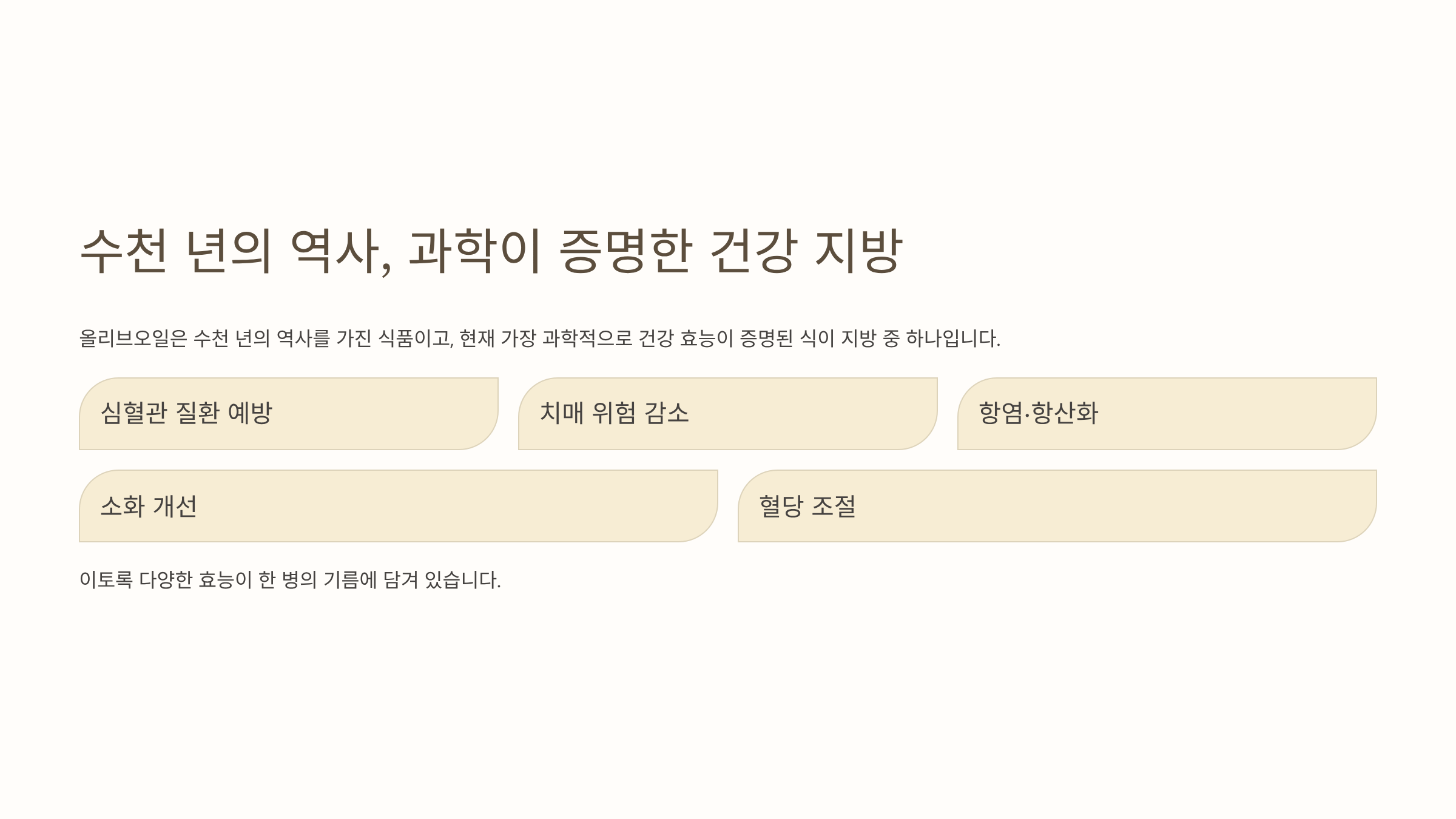 올리브오일은 수천 년의 역사를 가진 식품이고, 현재 가장 과학적으로 건강 효능이 증명된 식이 지방 중 하나입니다. 심혈관 질환 예방, 치매 위험 감소, 항염·항산화, 소화 개선, 혈당 조절까지 이토록 다양한 효능이 한 병의 기름에 담겨 있습니다.