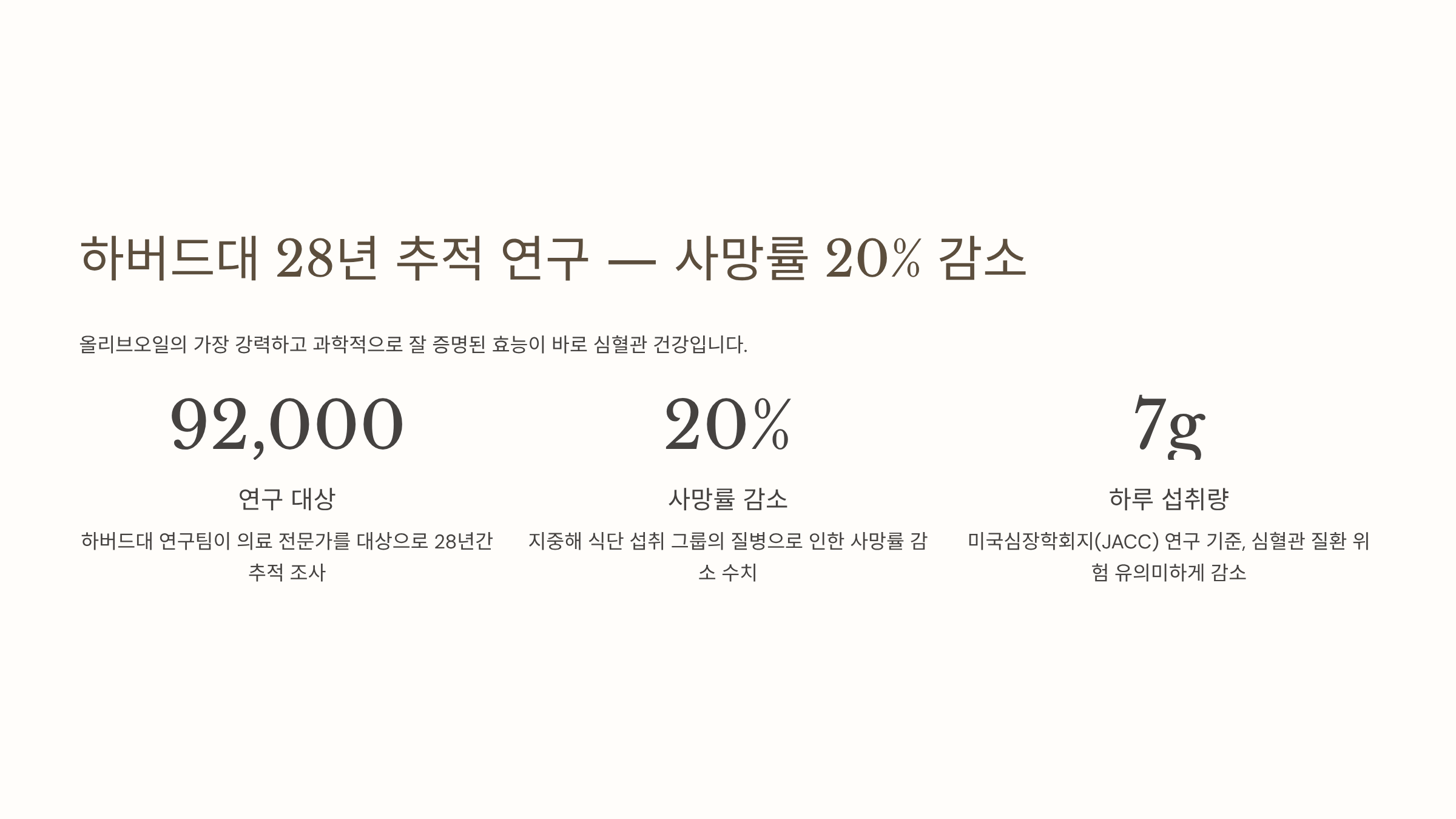 미국 하버드대 연구팀이 약 9만2,000명의 의료 전문가를 대상으로 28년간 추적 조사한 결과, 올리브오일이 포함된 지중해 식단을 한 사람은 그렇지 않은 사람에 비해 질병으로 인한 사망이 약 20% 낮게 나타났습니다. 국제학술지 미국심장학회지(Journal of the American College of Cardiology)에 실린 연구에서도 매일 올리브오일 약 7g(반 스푼 이상)을 섭취한 사람들에게서 심혈관 질환, 폐질환 등의 발생 위험이 유의미하게 감소했습니다.