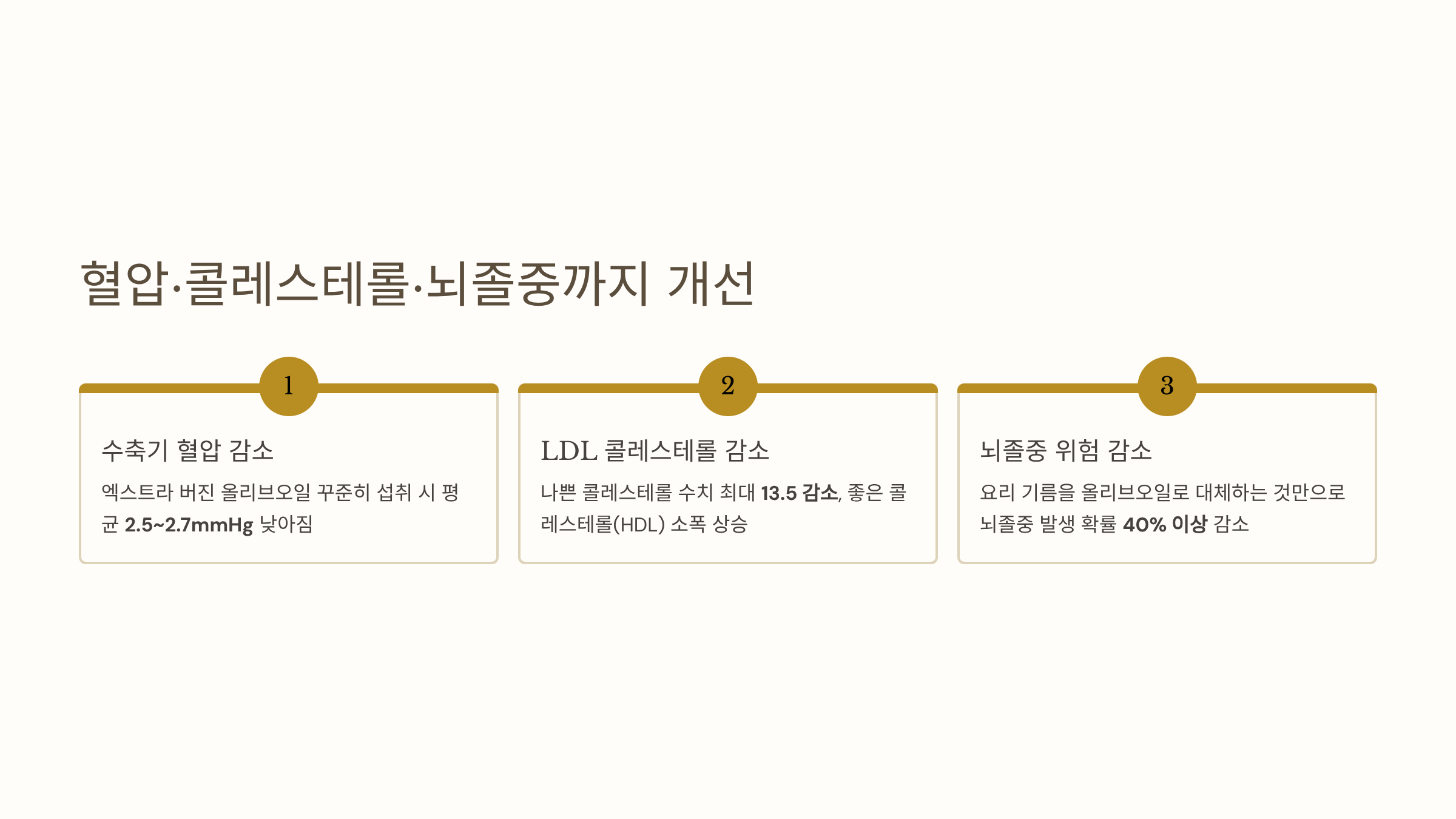 최근 발표된 연구에서는 엑스트라 버진 올리브오일을 꾸준히 섭취한 그룹에서 수축기 혈압이 평균 2.5~2.7mmHg 낮아지고, 나쁜 콜레스테롤(LDL) 수치는 최대 13.5 감소했으며, 좋은 콜레스테롤(HDL) 수치는 소폭 상승하는 결과가 확인되었습니다. 요리에 사용하는 기름을 올리브오일로 대체하는 것만으로도 뇌졸중 발생 확률이 40% 이상 낮아졌다는 연구 결과도 있습니다.