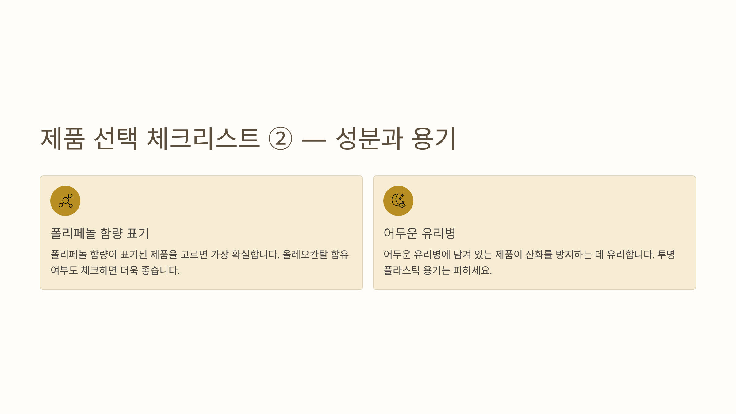 폴리페놀 함량이 표기된 제품을 고르면 가장 확실합니다. 올레오칸탈 함유 여부도 체크하면 더욱 좋습니다. 어두운 유리병에 담겨 있는 제품이 산화를 방지하는 데 유리합니다.
