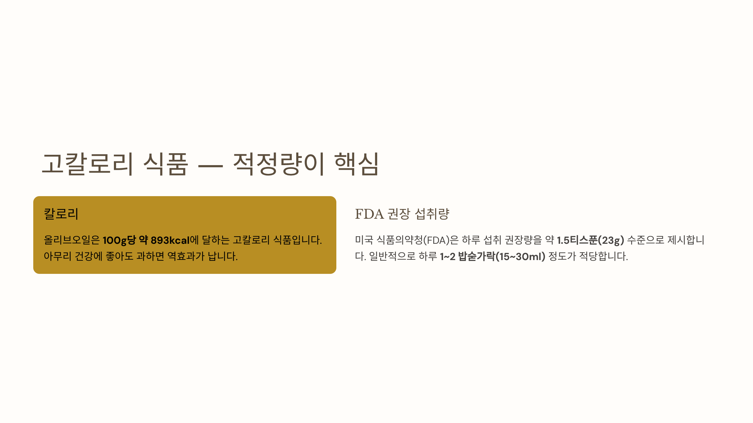 올리브오일은 칼로리가 100g당 약 893kcal에 달하는 고칼로리 식품입니다. 아무리 건강에 좋아도 과하면 역효과가 납니다. 미국 식품의약청(FDA)은 하루 섭취 권장량을 약 1.5티스푼(23g) 수준으로 제시하고 있으며, 일반적으로 하루 1~2 밥숟가락(15~30ml) 정도가 적당합니다.