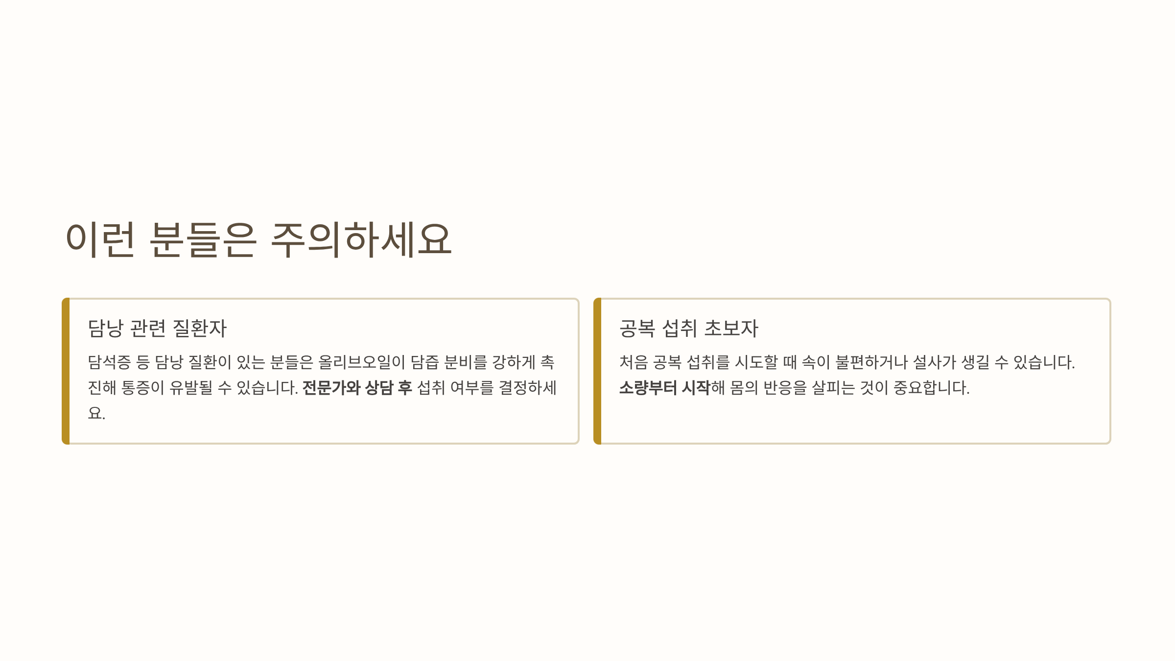 주의해야 할 상황도 있습니다. 담석증 등 담낭 관련 질환이 있는 분들은 올리브오일이 담즙 분비를 강하게 촉진하기 때문에 통증이 유발될 수 있으므로 전문가와 상담 후 섭취 여부를 결정하세요. 처음 공복 섭취를 시도할 때 속이 불편하거나 설사가 생길 수 있으니 소량부터 시작해 몸의 반응을 살피는 것이 중요합니다.