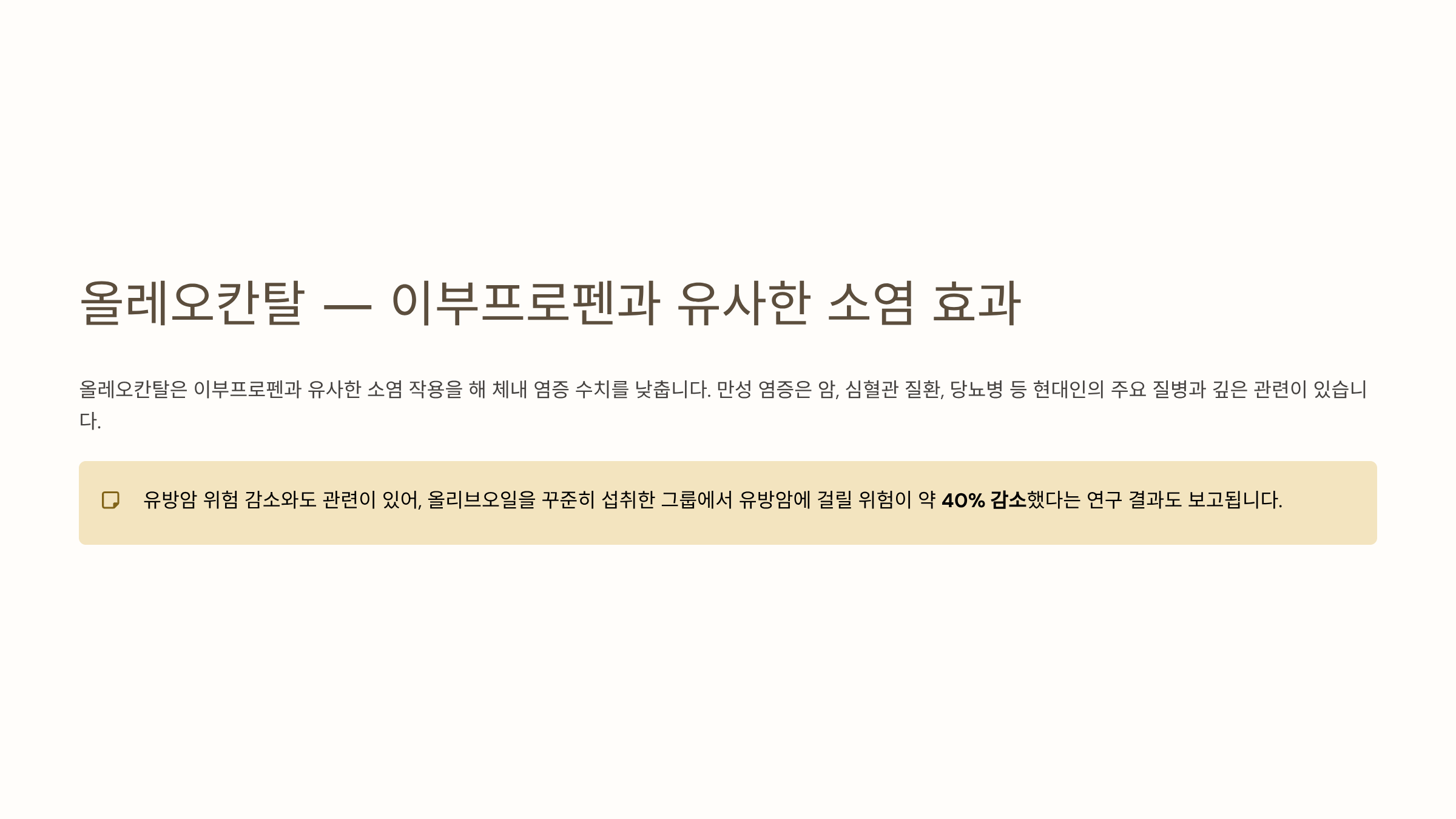 또한 올레오칸탈은 이부프로펜과 유사한 소염 작용을 해 체내 염증 수치를 낮춥니다. 만성 염증은 암, 심혈관 질환, 당뇨병 등 현대인의 주요 질병과 깊은 관련이 있기 때문에, 올레오칸탈의 항염증 효과는 단순한 노화 방지를 넘어 만성 질환 예방 차원에서도 중요한 역할을 합니다. 유방암 위험 감소와도 관련이 있어 유방암에 걸릴 위험이 약 40% 감소했다는 연구 결과도 보고됩니다.