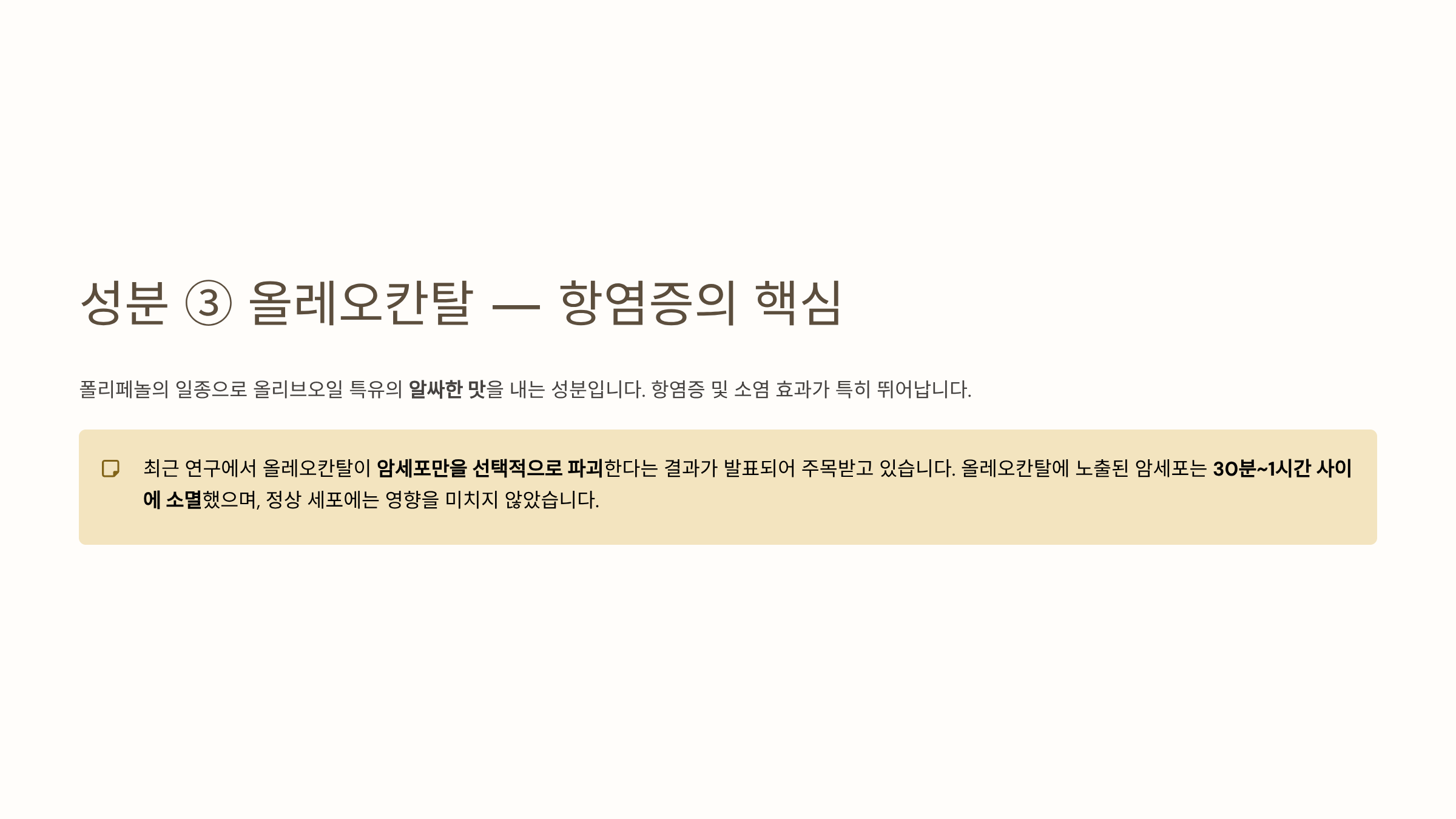 세 번째는 올레오칸탈(Oleocanthal)입니다. 폴리페놀의 일종으로 올리브오일 특유의 알싸한 맛을 내는 성분입니다. 항염증 및 소염 효과가 특히 뛰어나고, 최근 연구에서는 이 성분이 암세포만을 선택적으로 파괴한다는 결과가 발표되어 주목받고 있습니다. 연구에 따르면 올레오칸탈에 노출된 암세포는 30분에서 1시간 사이에 소멸했으며, 정상 세포에는 영향을 미치지 않았습니다.