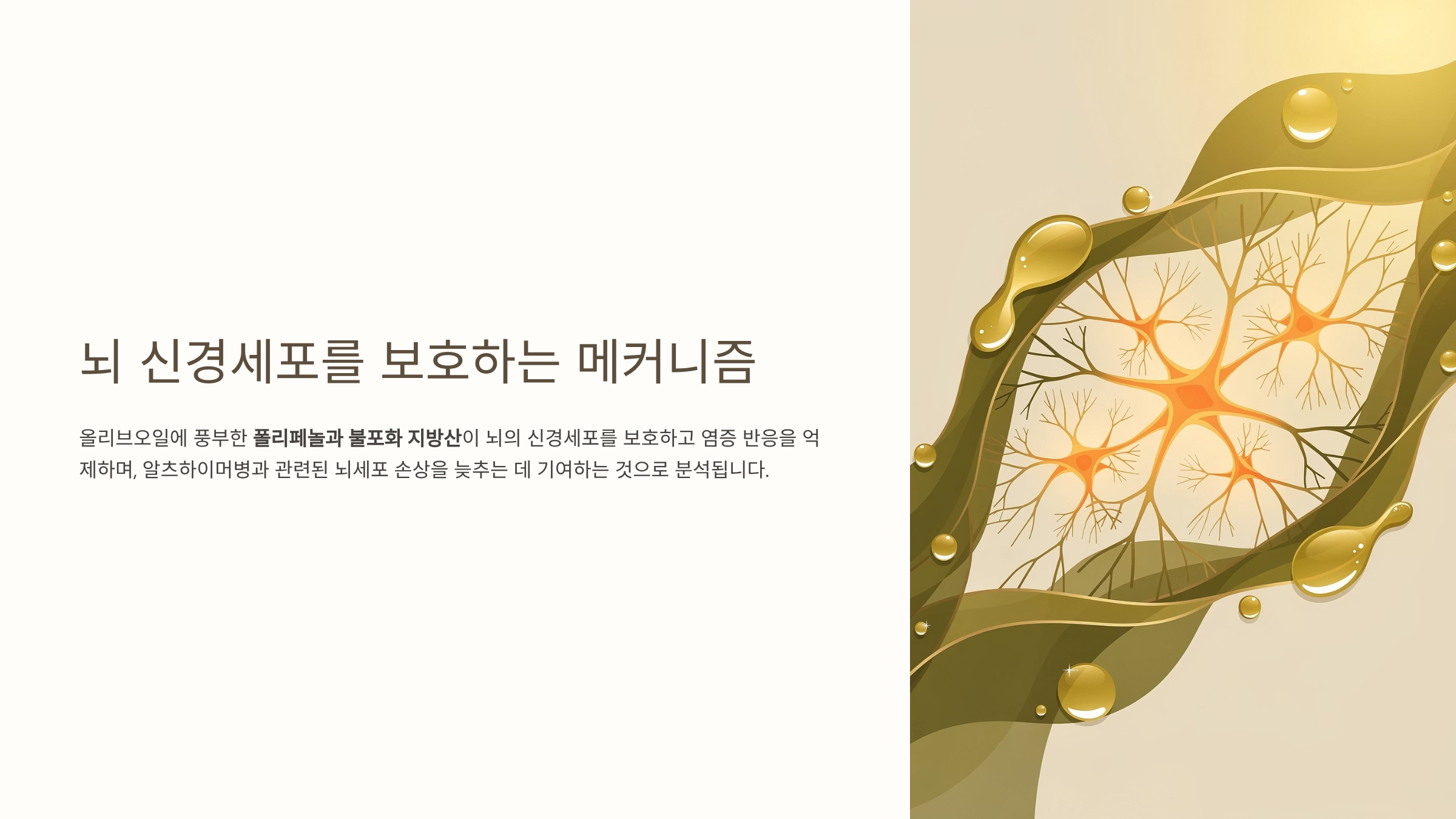 올리브오일에 풍부한 폴리페놀과 불포화 지방산이 뇌의 신경세포를 보호하고 염증 반응을 억제하며, 알츠하이머병과 관련된 뇌세포 손상을 늦추는 데 기여하는 것으로 분석됩니다.