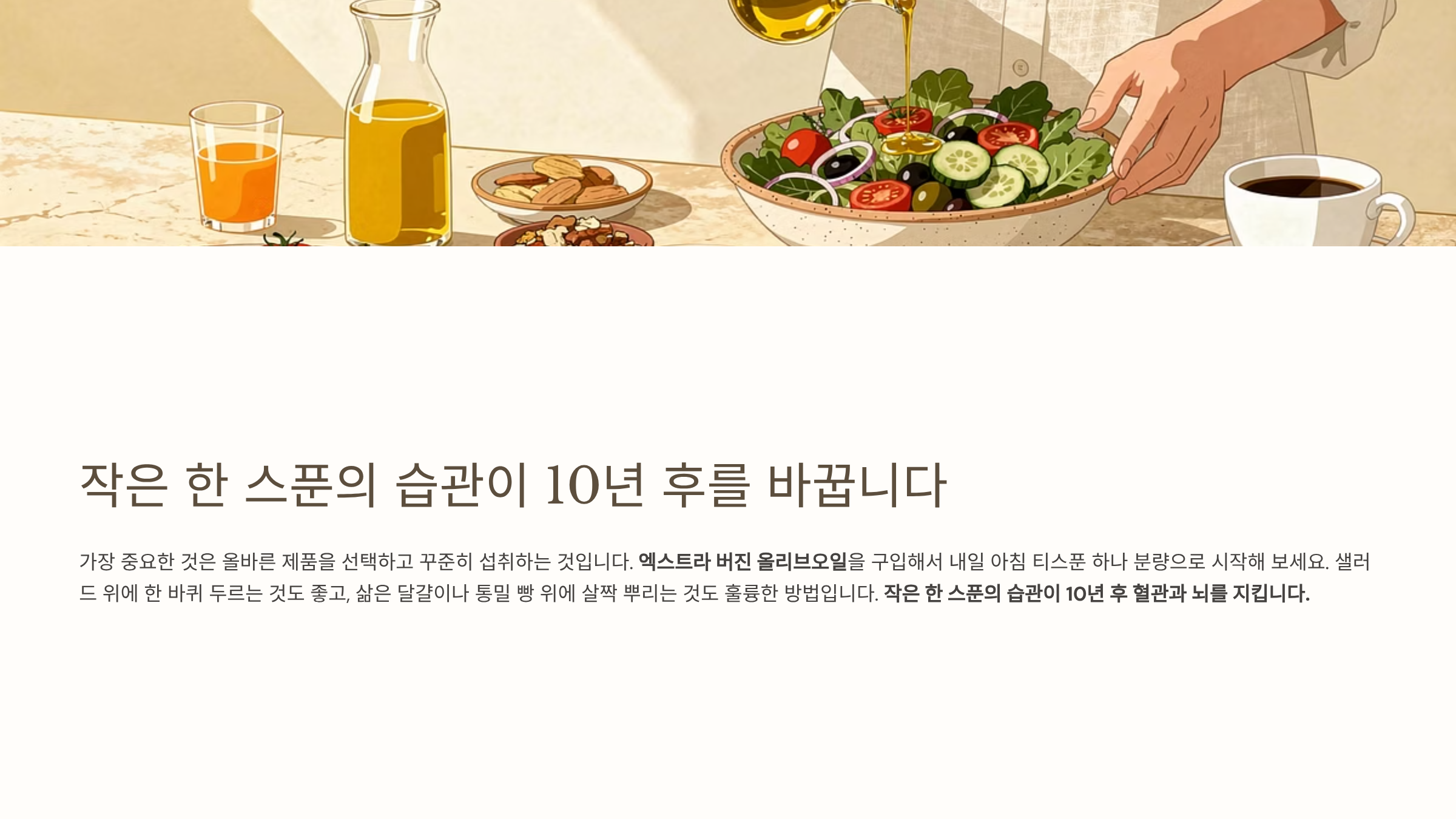가장 중요한 것은 올바른 제품을 선택하고 꾸준히 섭취하는 것입니다. 엑스트라 버진 올리브오일을 구입해서 내일 아침 티스푼 하나 분량으로 시작해 보세요. 샐러드 위에 한 바퀴 두르는 것도 좋고, 삶은 달걀이나 통밀 빵 위에 살짝 뿌리는 것도 훌륭한 방법입니다. 작은 한 스푼의 습관이 10년 후 혈관과 뇌를 지킵니다.