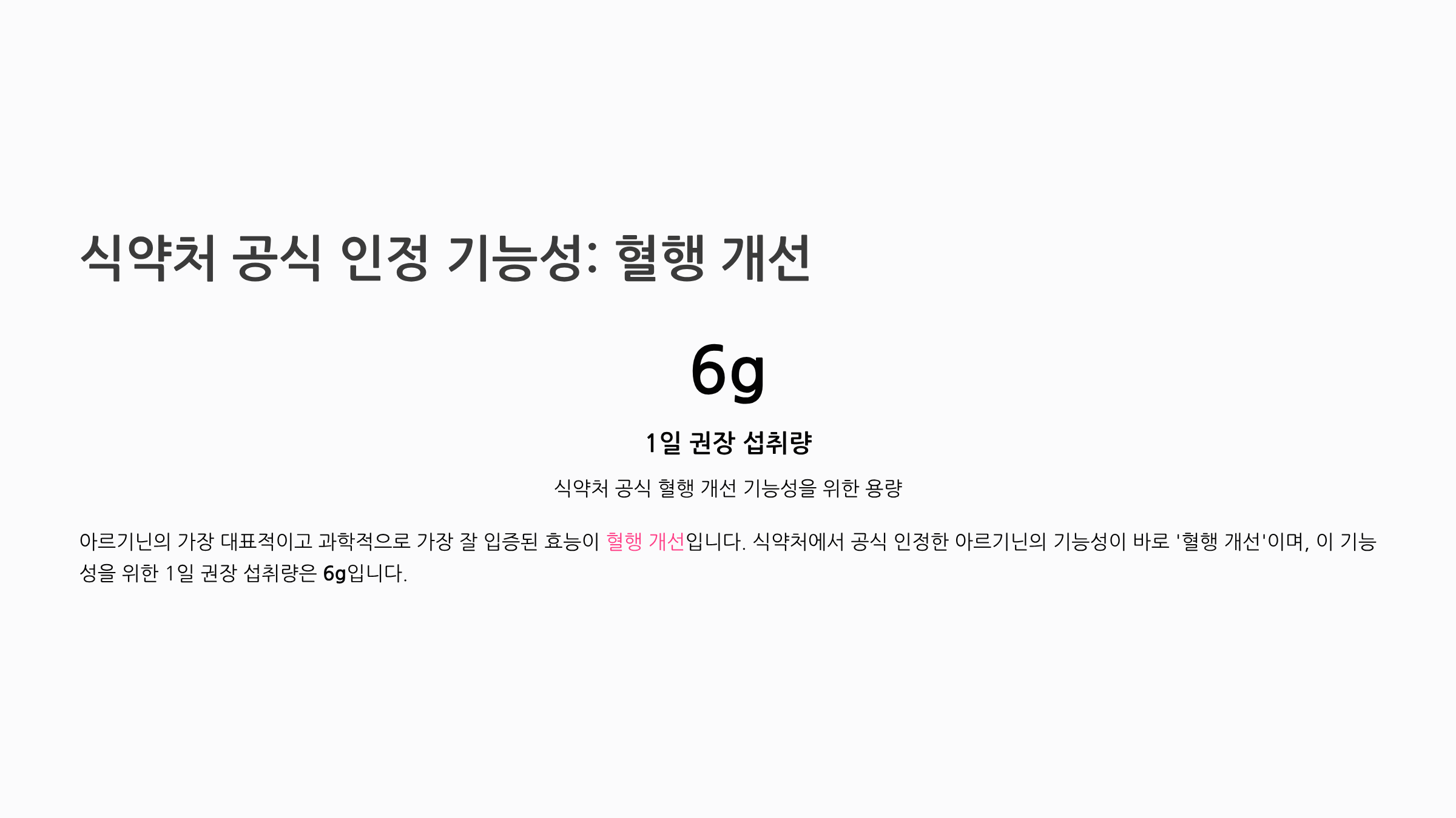 아르기닌의 가장 대표적이고 과학적으로 가장 잘 입증된 효능이 혈행 개선입니다. 식약처에서 공식 인정한 아르기닌의 기능성이 바로 '혈행 개선'이며, 이 기능성을 위한 1일 권장 섭취량은 6g입니다.