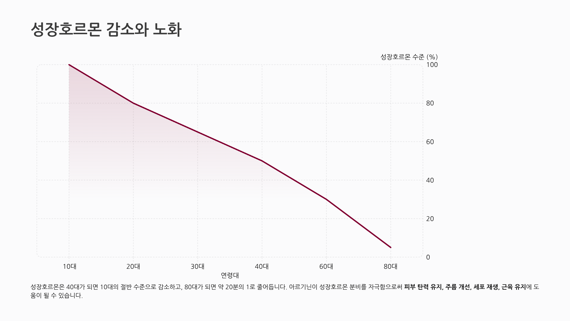 성장호르몬은 성장기 어린이에게만 필요한 것이 아닙니다. 성인에서도 피부, 근육, 세포 유지와 노화된 세포의 복구 및 재생을 담당합니다. 성장호르몬은 40대가 되면 10대의 절반 수준으로 감소하고, 80대가 되면 10대의 약 20분의 1로 줄어듭니다. 아르기닌이 성장호르몬 분비를 자극함으로써 피부 탄력 유지, 주름 개선, 세포 재생, 근육 유지에 도움이 될 수 있습니다. 이러한 이유로 40~50대 이상의 노화 예방이나 젊음 유지를 목적으로 아르기닌을 찾는 분들도 늘고 있습니다.