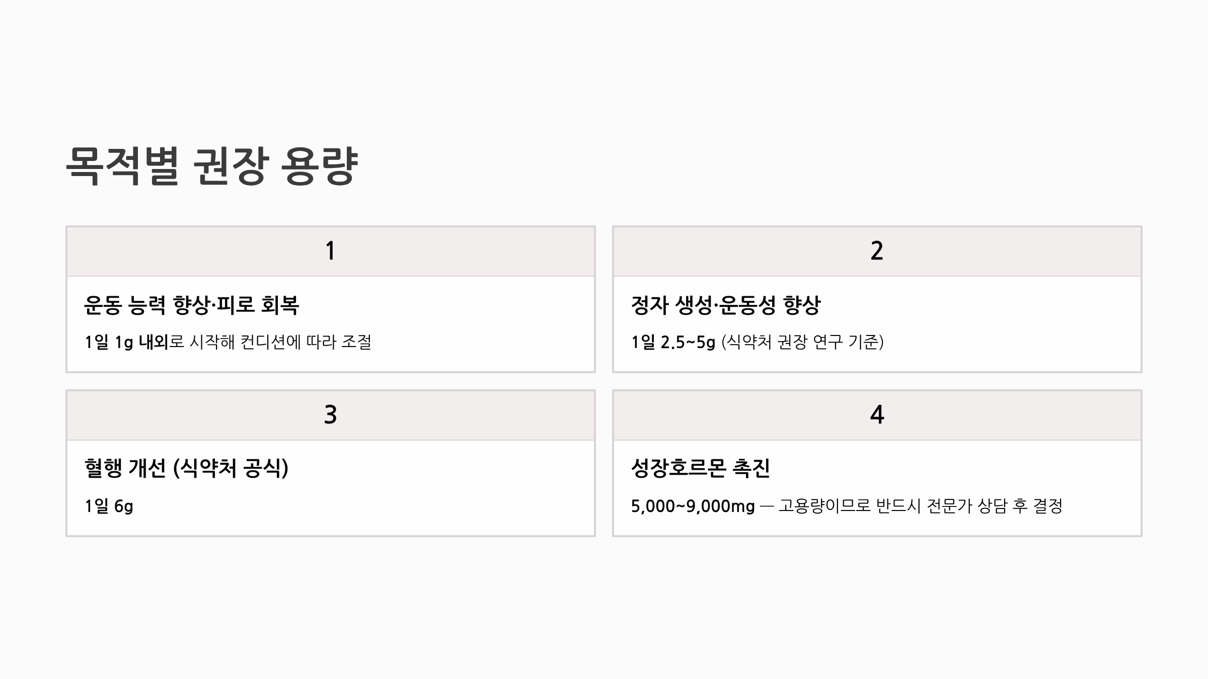 운동 능력 향상 및 피로 회복이 목적이라면 1일 1g 내외로 시작해 컨디션에 따라 조절하세요. 정자 생성 및 운동성 향상이 목적이라면 1일 2.5~5g, 혈행 개선(식약처 공식 기능성)을 위한 용량은 1일 6g입니다. 성장호르몬 촉진 효과를 원한다면 5,000~9,000mg이 가장 효과적이라는 임상 논문이 있지만, 이는 고용량이므로 반드시 전문가와 상담 후 결정하세요.