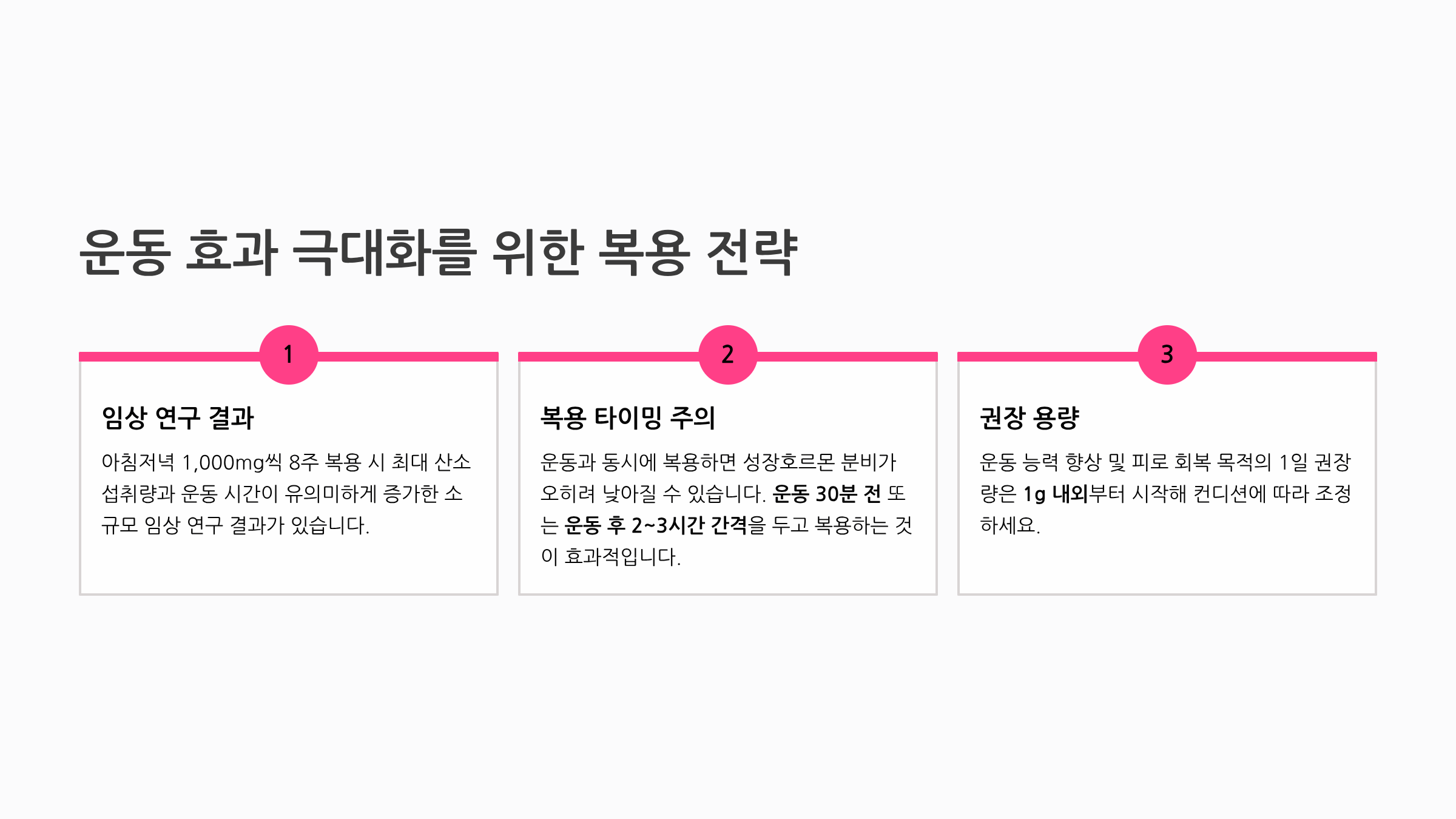 아침저녁으로 1,000mg씩 아르기닌을 8주간 복용하면서 운동한 경우, 섭취 전보다 최대 산소 섭취량과 운동 시간이 유의미하게 증가한 소규모 임상 연구 결과도 있습니다. 단, 운동과 아르기닌을 동시에 복용하면 성장호르몬 분비가 오히려 낮아질 수 있다는 연구가 있어, 운동 시작 30분 전이나 운동 후 2~3시간 간격을 두고 복용하는 것이 더 효과적입니다. 운동 능력 향상 및 피로 회복 목적의 1일 권장량은 1g 내외부터 시작해 컨디션에 따라 조정하는 것이 좋습니다.