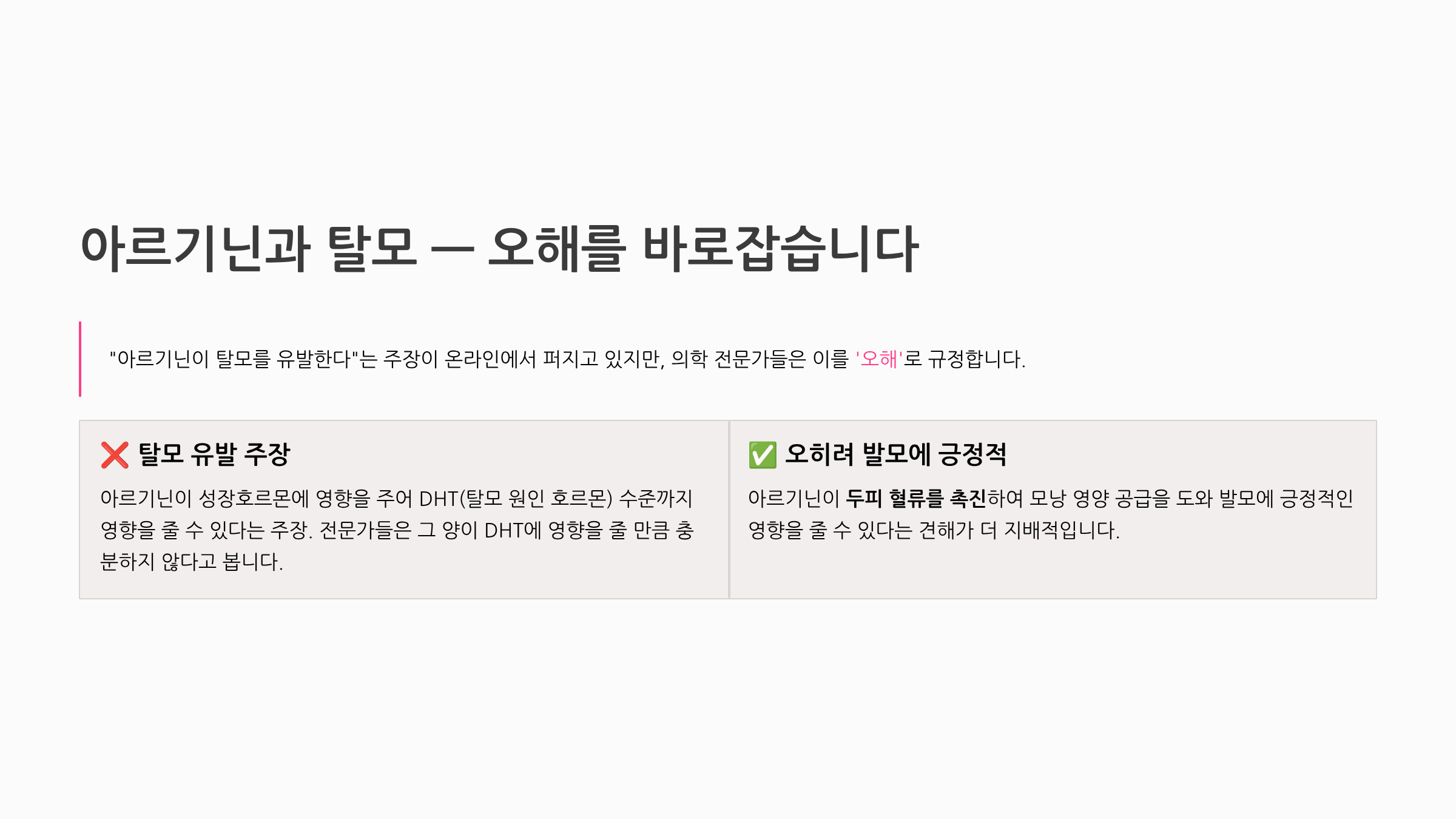 한 가지 자주 나오는 오해를 정리하겠습니다. 아르기닌이 탈모를 유발한다는 주장이 온라인에서 퍼지고 있는데, 의학 전문가들은 이를 '오해'로 규정합니다. 아르기닌이 성장호르몬에 영향을 주더라도 이것이 DHT(탈모 원인 호르몬) 수준까지 영향을 줄 만한 양이 된다고 보기 어렵습니다. 오히려 아르기닌이 두피 혈류를 촉진하여 모낭 영양 공급을 도와 발모에 긍정적인 영향을 줄 수 있다는 견해가 더 지배적입니다.