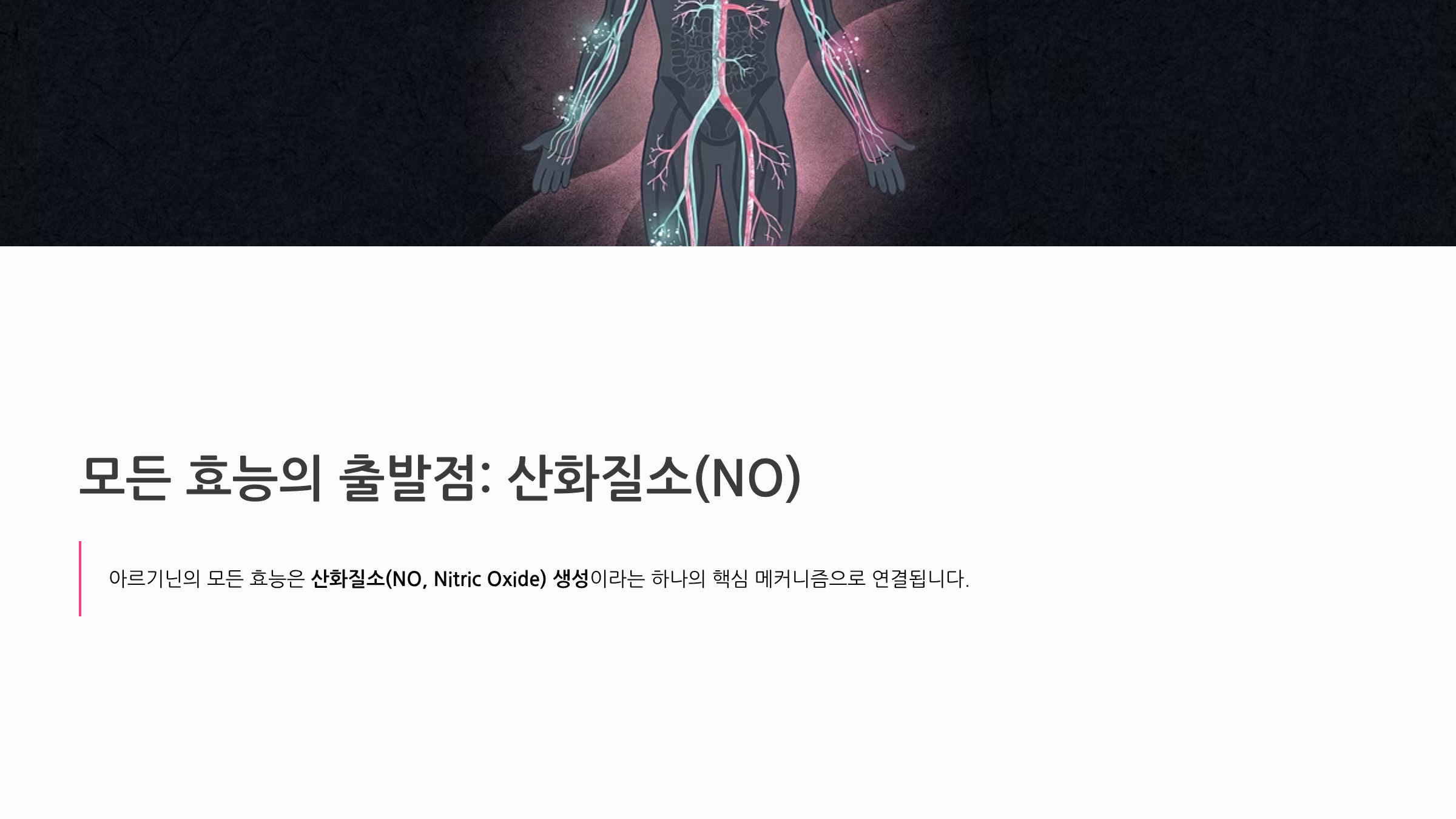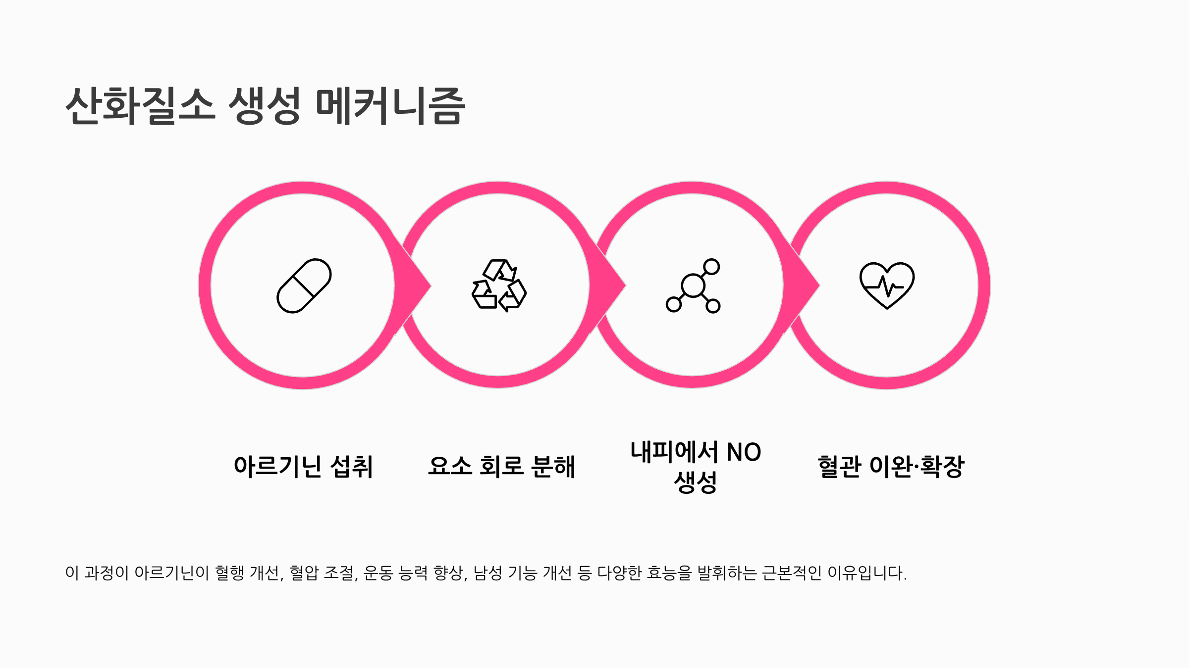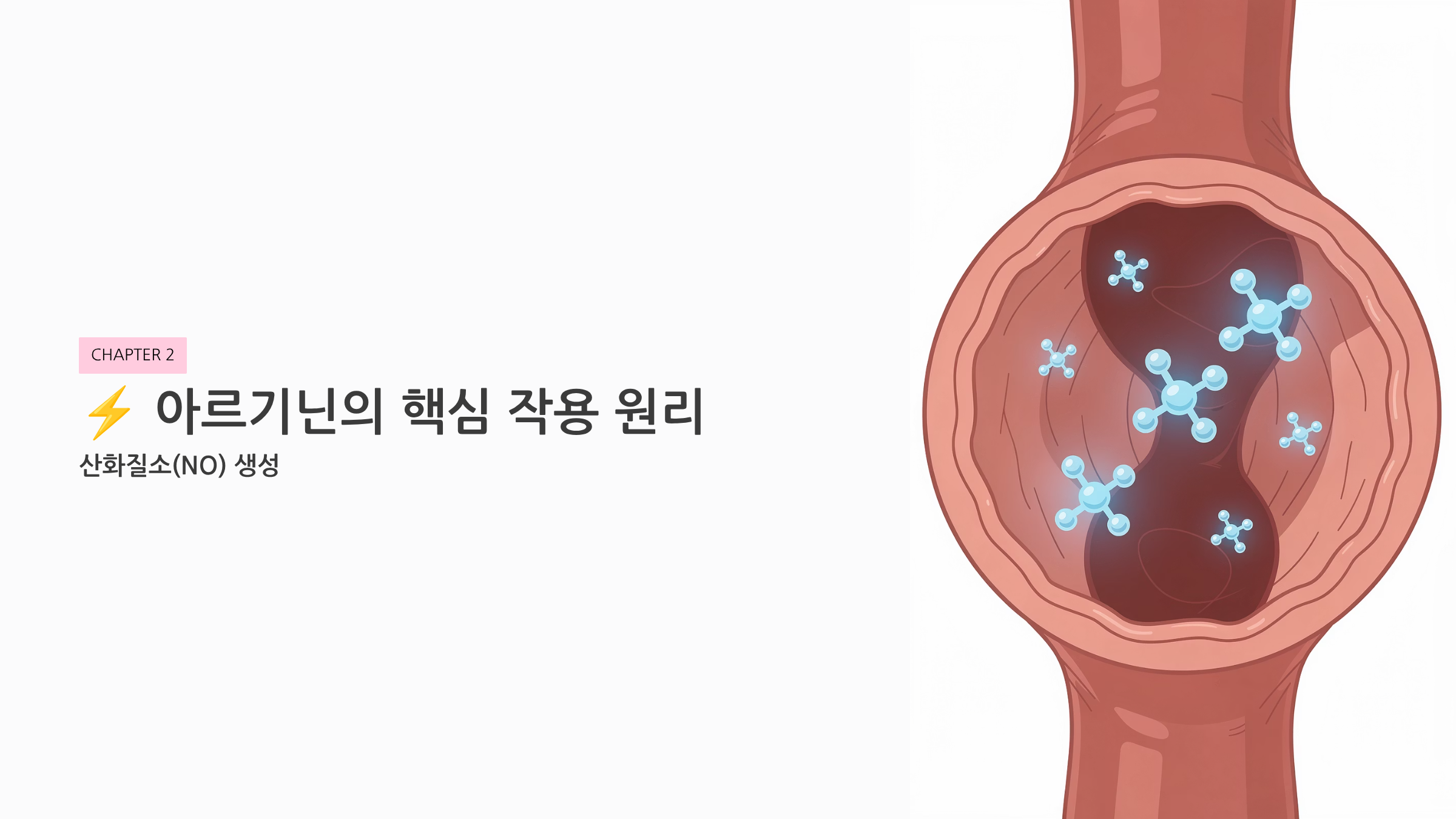 아르기닌의 모든 효능은 산화질소(NO, Nitric Oxide) 생성이라는 하나의 핵심 메커니즘으로 연결됩니다.