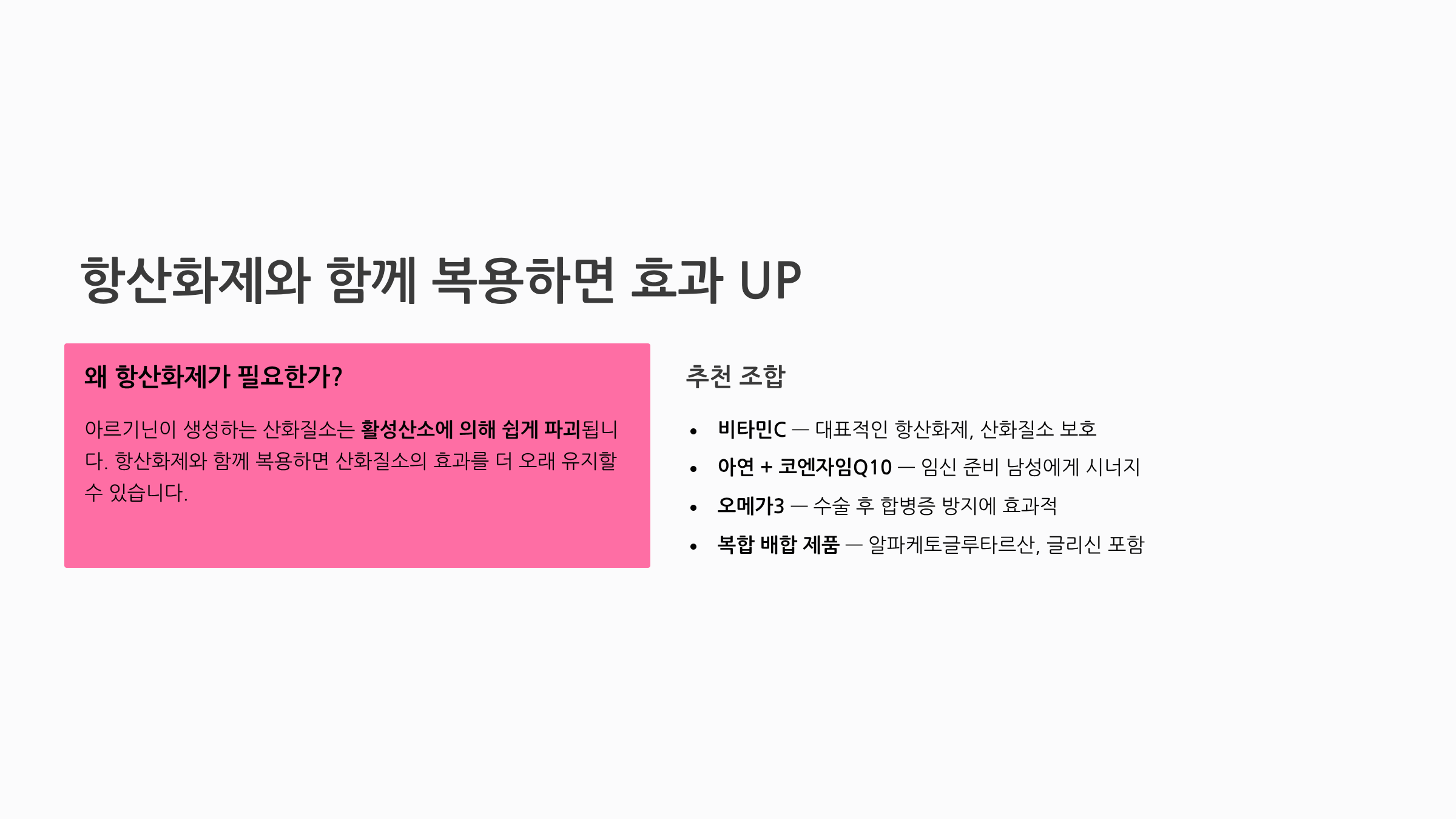 항산화 효과를 극대화하려면 아르기닌이 생성하는 산화질소가 활성산소에 의해 쉽게 파괴되기 때문에 비타민C 등 항산화제와 함께 복용하면 부작용 없이 효과를 높일 수 있습니다.