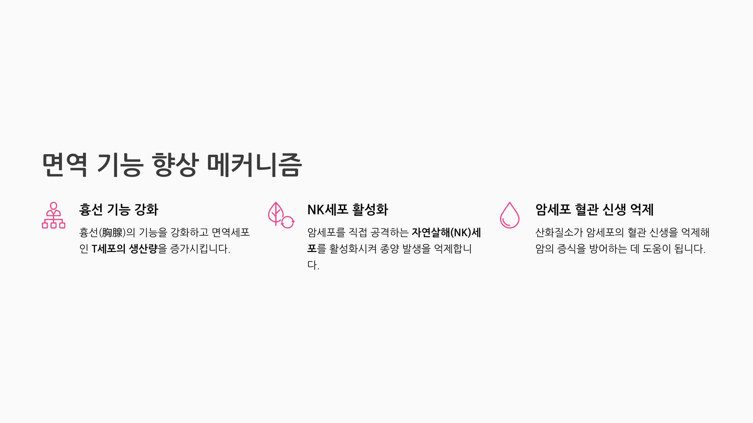 아르기닌은 흉선(胸腺)의 기능을 강화하고 면역세포의 일종인 T세포의 생산량을 증가시킵니다. 또한 암세포를 직접 공격하는 자연살해(NK)세포를 활성화시켜 면역 체계를 강화하고 종양 발생을 억제하는 작용도 합니다. 아르기닌에서 생성된 산화질소는 암세포의 혈관 신생을 억제해 암의 증식을 방어하는 데도 도움이 된다고 알려져 있습니다.