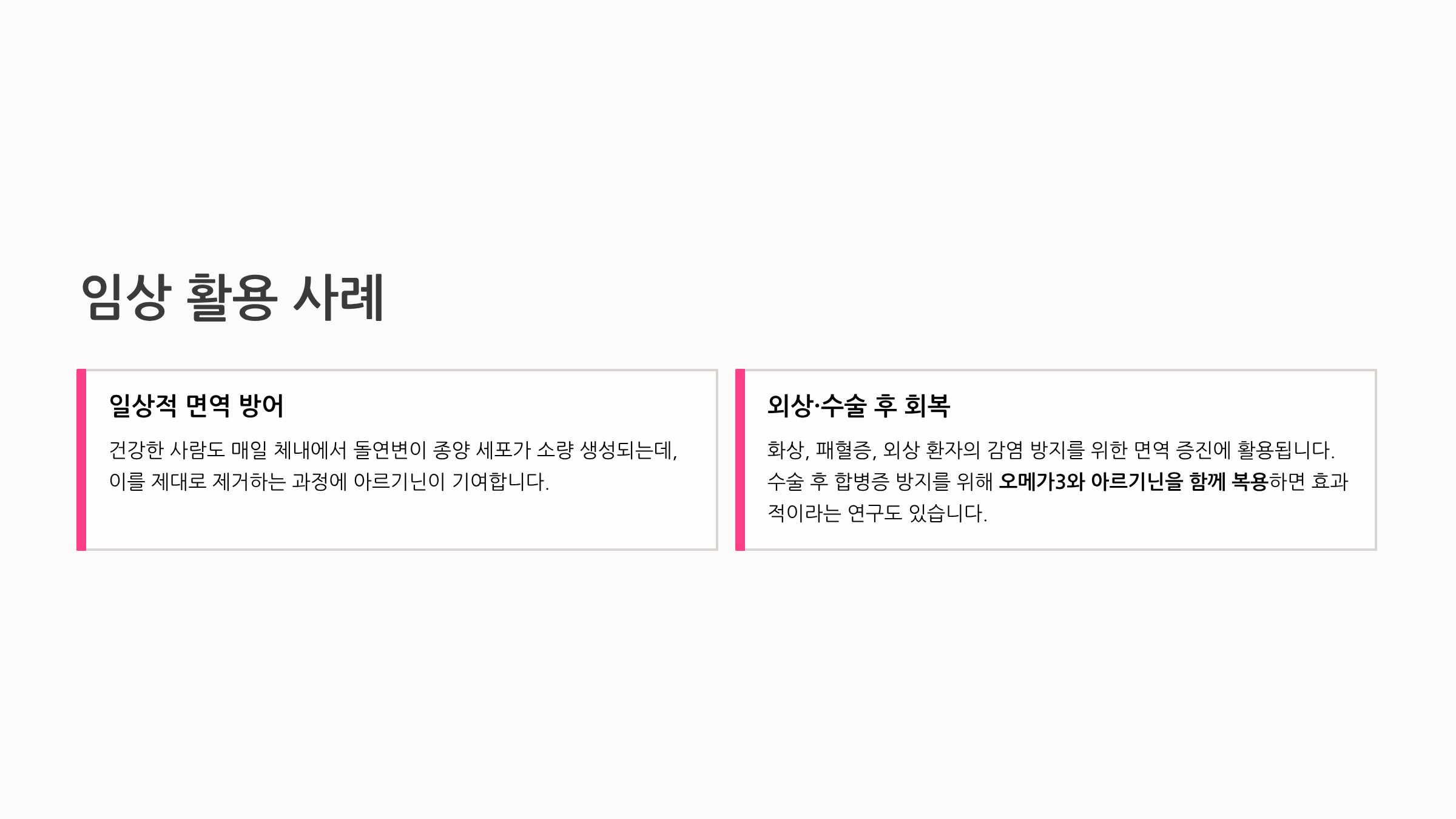 건강한 사람도 매일 체내에서 돌연변이 종양 세포가 소량 생성되는데, 이를 제대로 제거하는 과정에 아르기닌이 기여합니다. 화상, 패혈증, 외상 환자의 감염 방지를 위한 면역 증진에도 활용되며, 수술 후 합병증 방지를 위해 오메가3와 아르기닌을 함께 복용하면 효과적이라는 연구도 있습니다.