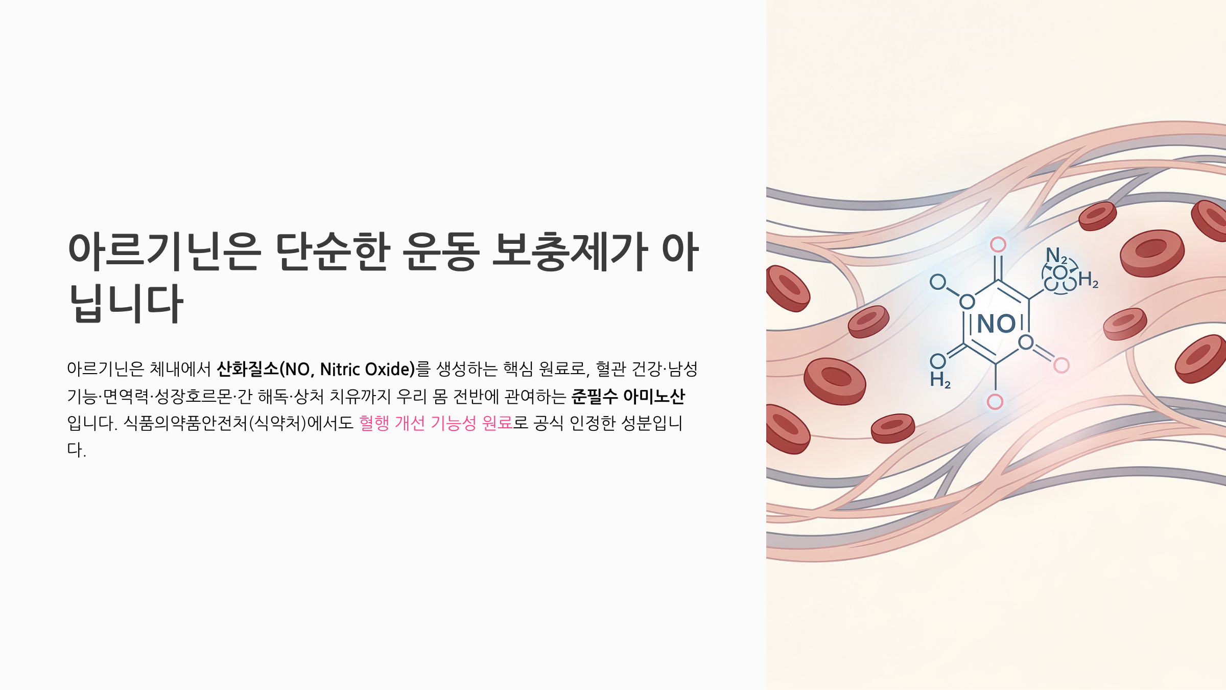 아르기닌은 단순한 운동 보충제가 아닙니다. 체내에서 산화질소(NO, Nitric Oxide)를 생성하는 핵심 원료로, 혈관 건강, 남성 기능, 면역력, 성장호르몬, 간 해독, 상처 치유까지 우리 몸 전반에 관여하는 준필수 아미노산입니다. 식품의약품안전처(식약처)에서도 혈행 개선 기능성 원료로 공식 인정한 성분입니다.