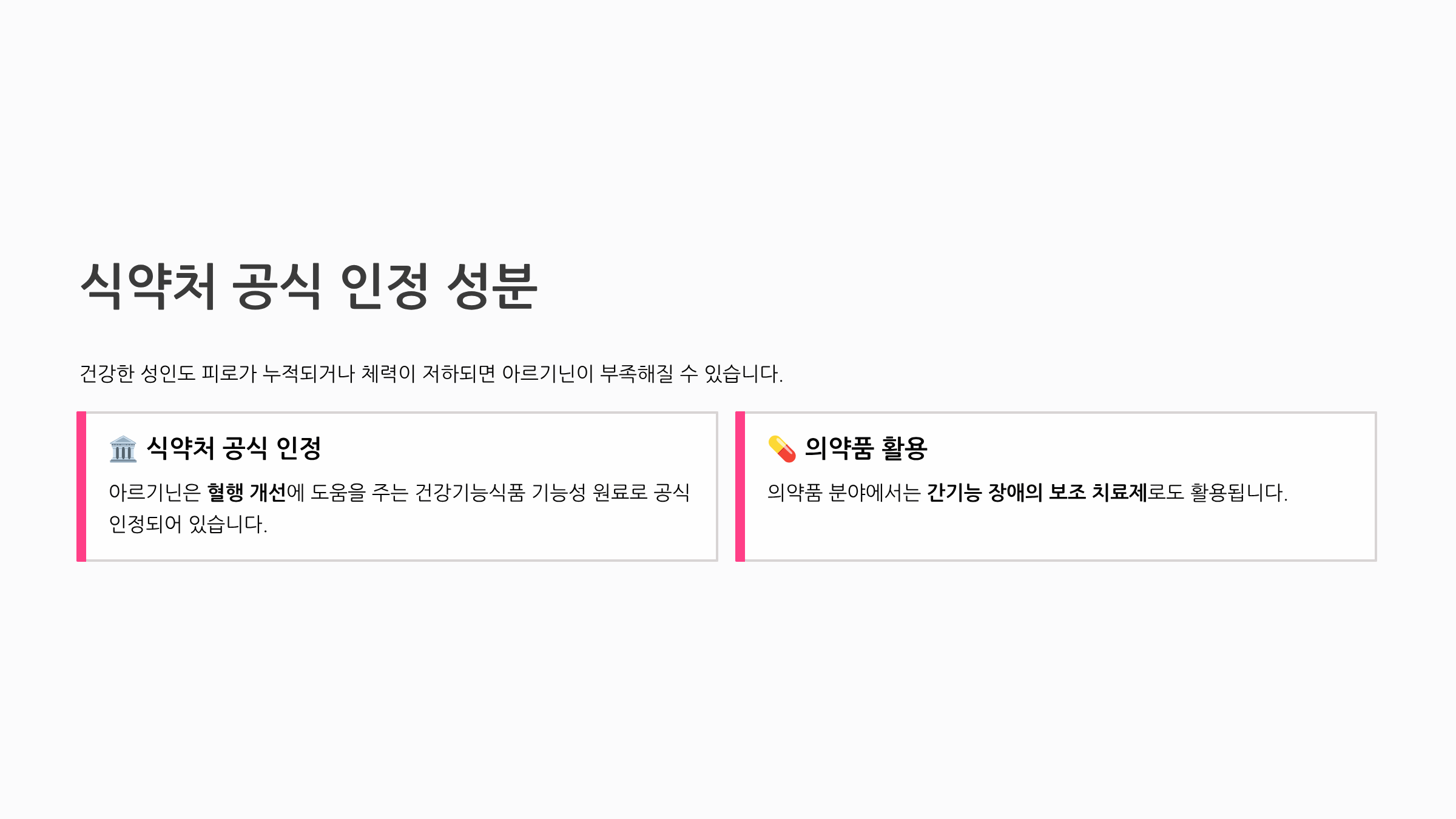 건강한 성인도 피로가 누적되거나 체력이 저하되면 아르기닌이 부족해질 수 있습니다. 식약처에서는 아르기닌을 혈행 개선에 도움을 주는 건강기능식품 기능성 원료로 공식 인정하고 있으며, 의약품 분야에서는 간기능 장애의 보조 치료제로도 활용됩니다.