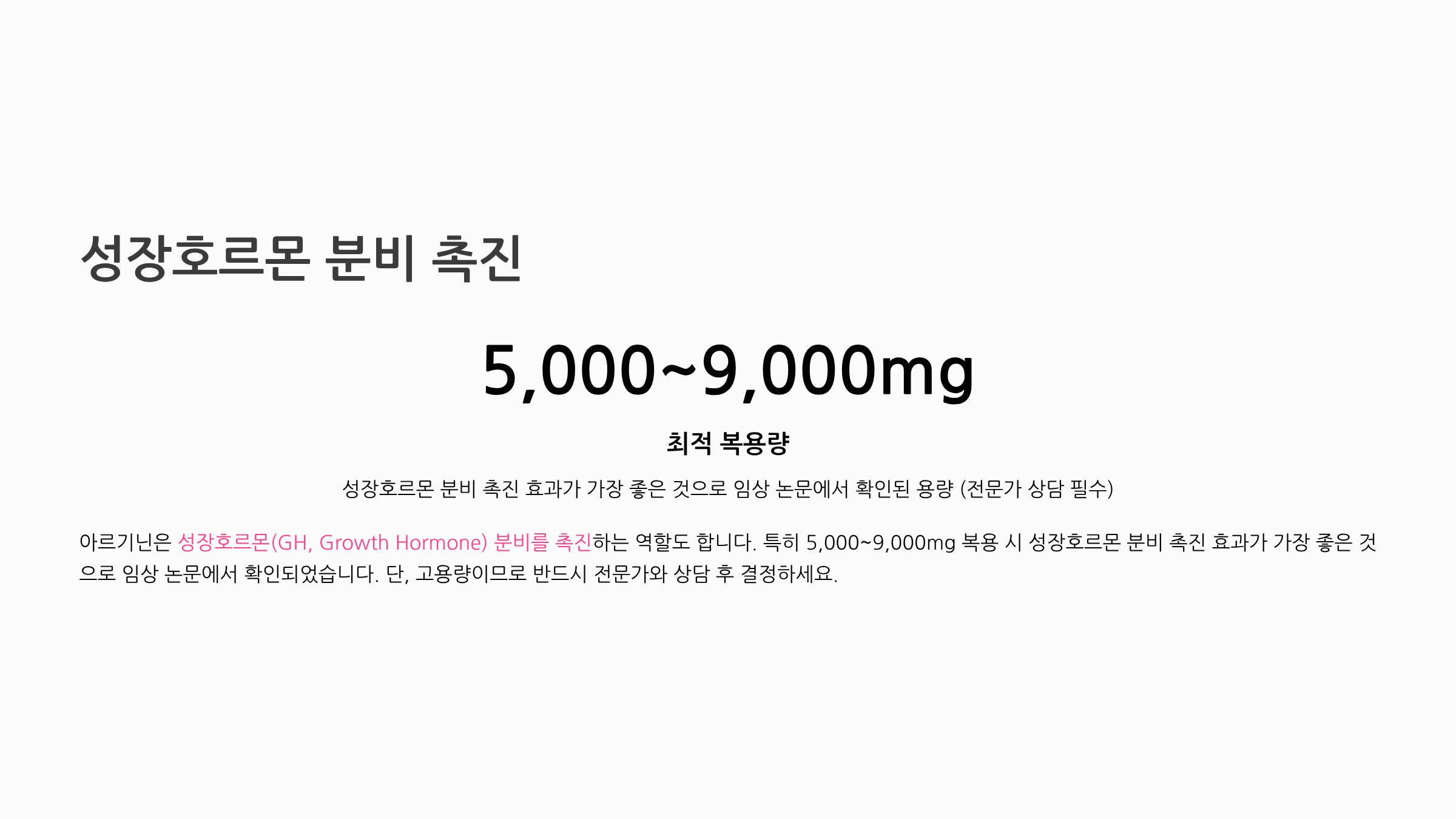 아르기닌은 성장호르몬(GH, Growth Hormone) 분비를 촉진하는 역할도 합니다. 특히 5,000~9,000mg 복용 시 성장호르몬 분비 촉진 효과가 가장 좋은 것으로 임상 논문에서 확인되었습니다.