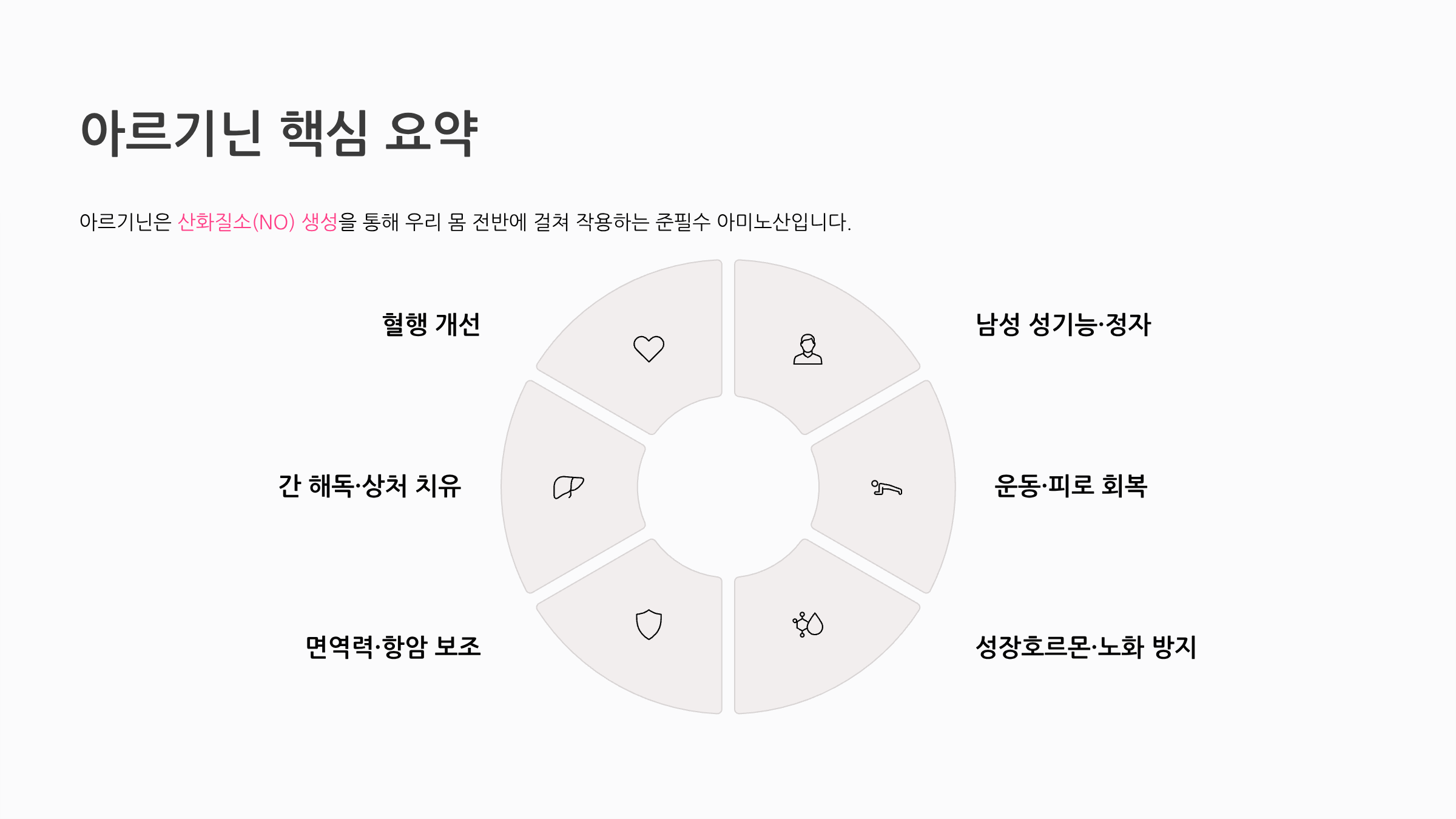 아르기닌은 산화질소(NO) 생성을 통해 혈행 개선, 남성 성기능 향상, 운동 능력 강화, 성장호르몬 촉진, 면역력 강화, 간 해독, 상처 치유, 피부 재생까지 우리 몸 전반에 걸쳐 작용하는 준필수 아미노산입니다.