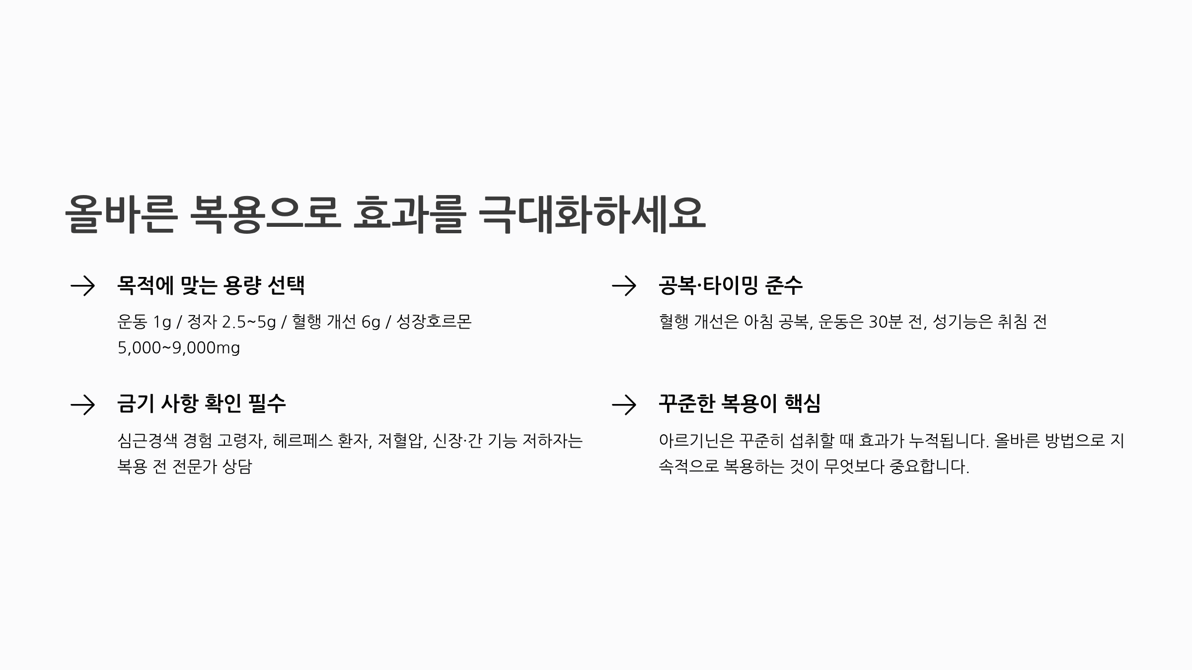 복용 목적에 맞는 용량을 선택하고, 공복 또는 운동 전·후 타이밍을 지키는 것이 효과를 극대화하는 핵심입니다. 심근경색 경험 고령자, 헤르페스 환자, 저혈압, 신장·간 기능 저하자는 복용을 피하거나 반드시 전문가와 상담 후 결정하세요. 아르기닌은 꾸준히 섭취할 때 그 효과가 누적되므로, 올바른 방법으로 지속적으로 복용하는 것이 무엇보다 중요합니다.
