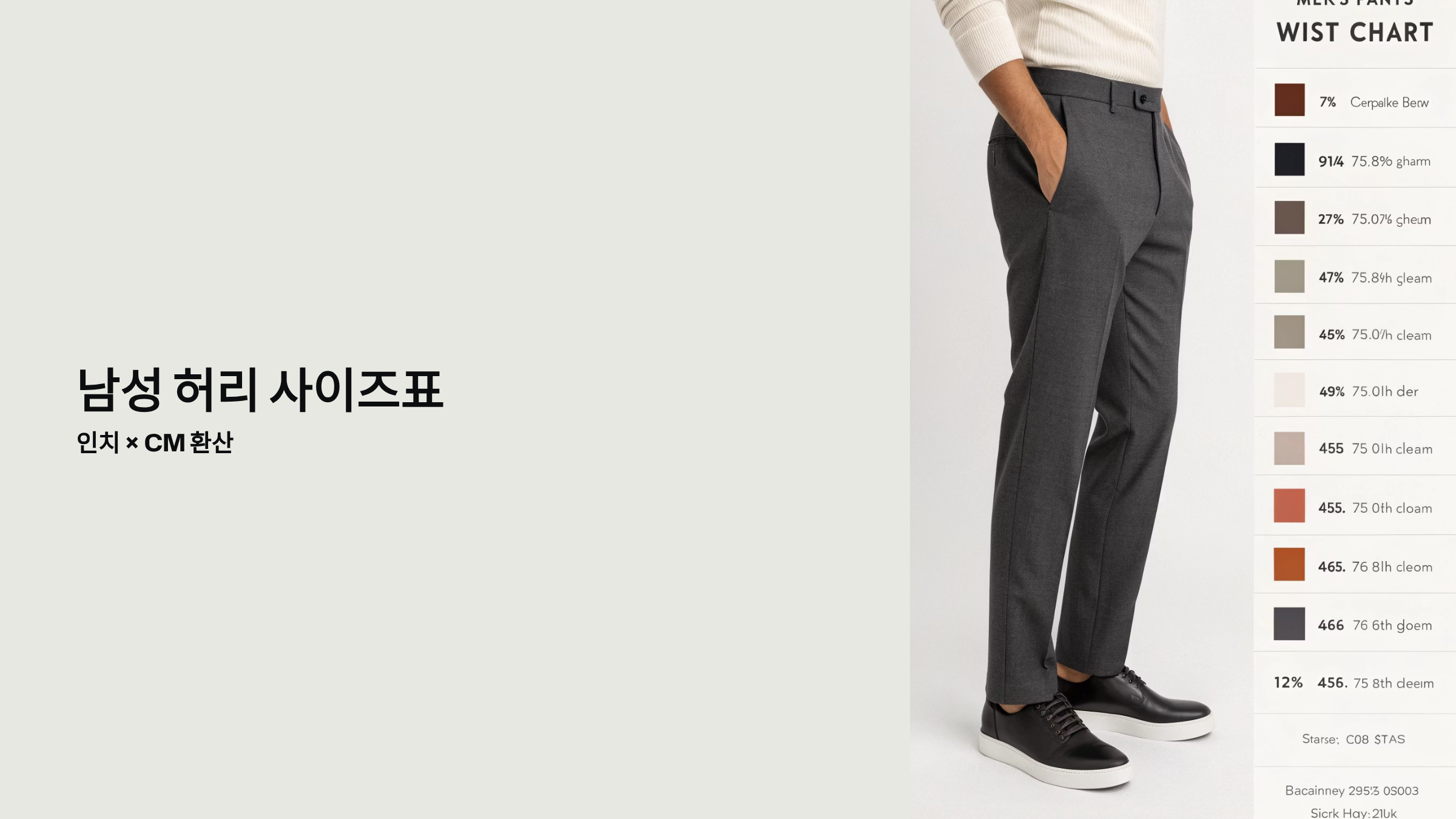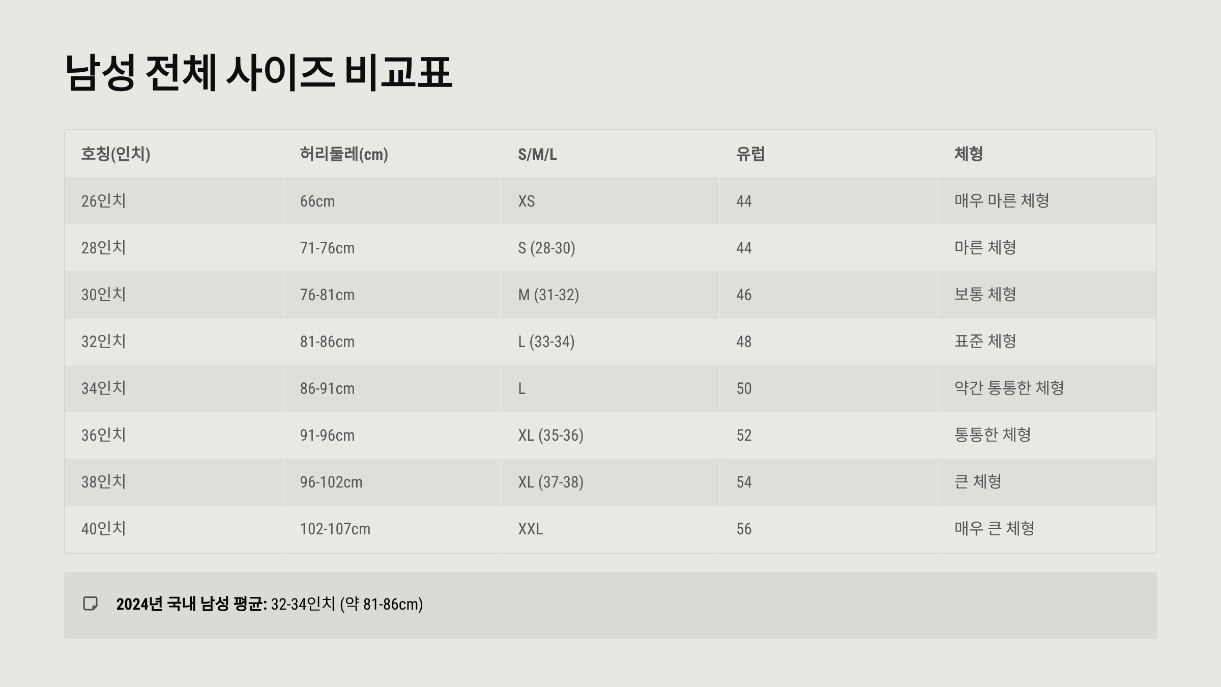 📐 남성 허리 사이즈표 (인치 × cm 환산)
