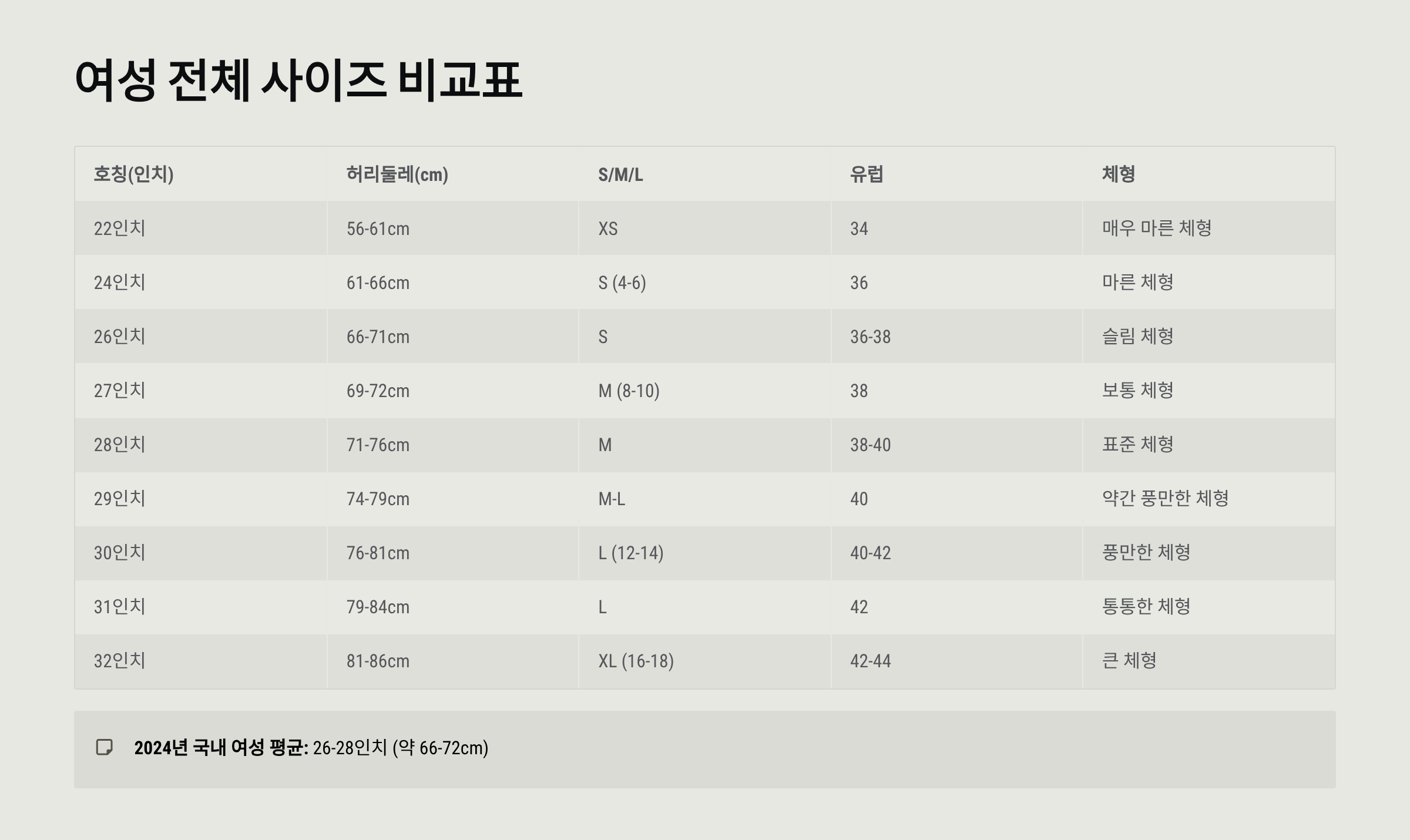 👩 여성 허리 사이즈표 (인치 × cm 환산)