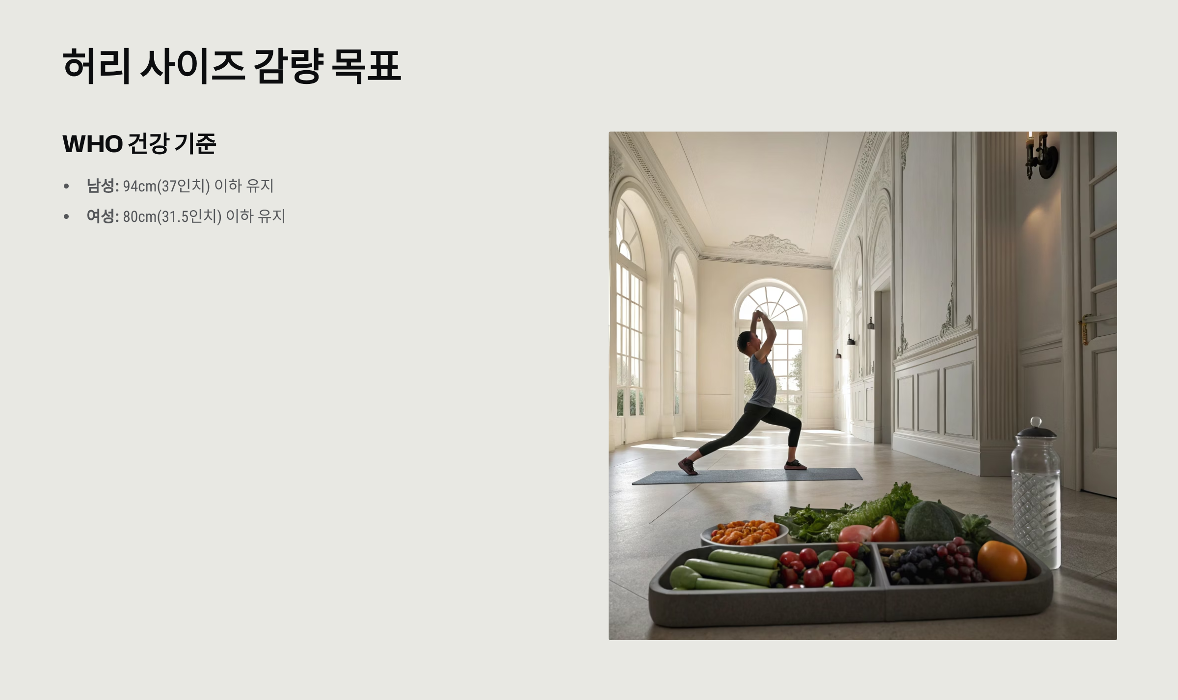 - 여성: 80cm(31.5인치) 이하 유지