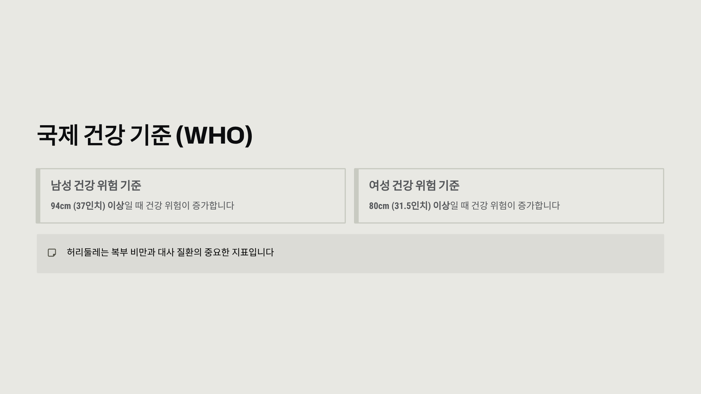 - 여성: 80cm(31.5인치) 이상 = 건강 위험 증가