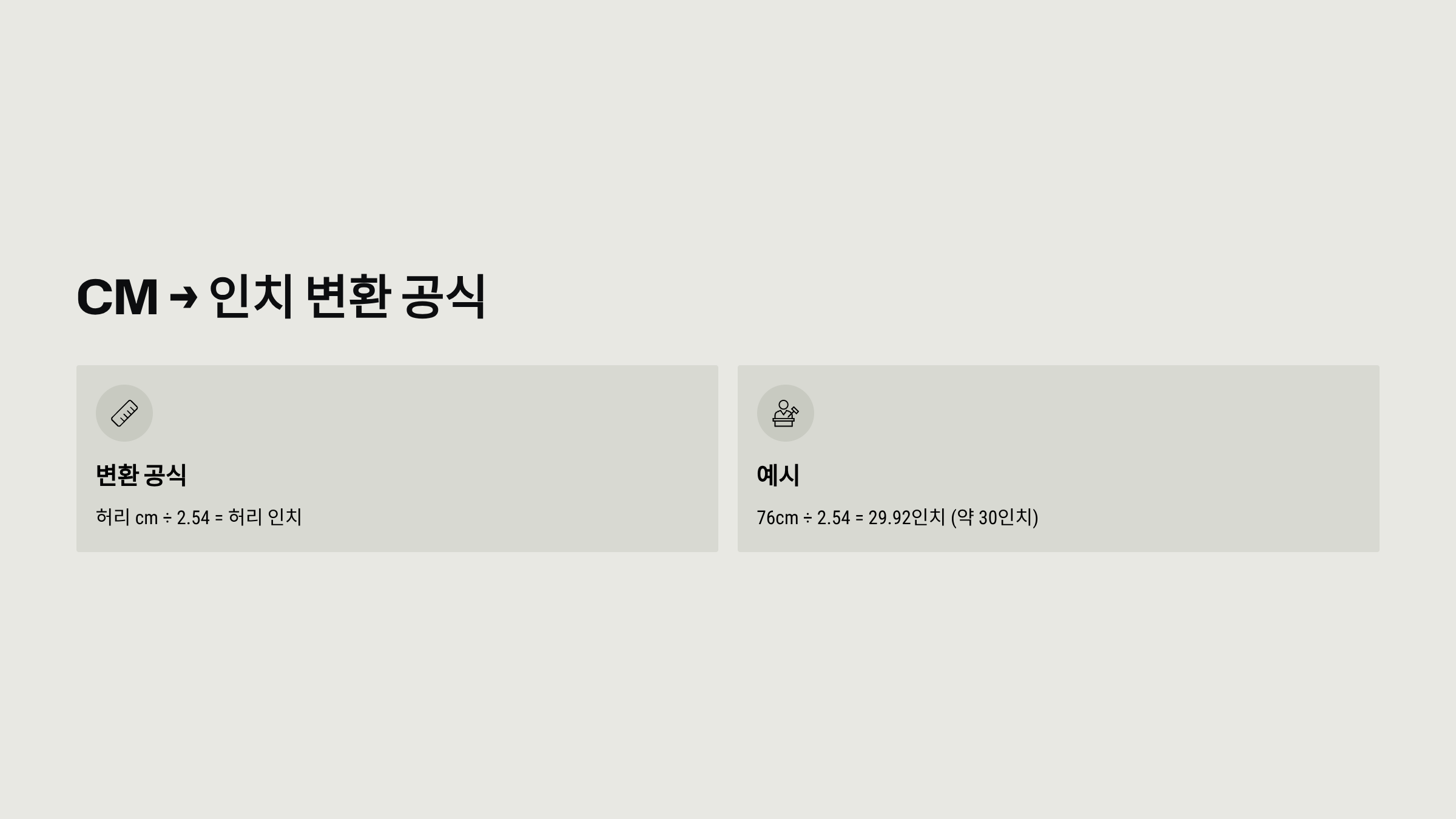 - 예) 76cm ÷ 2.54 = 29.92인치 (약 30인치)