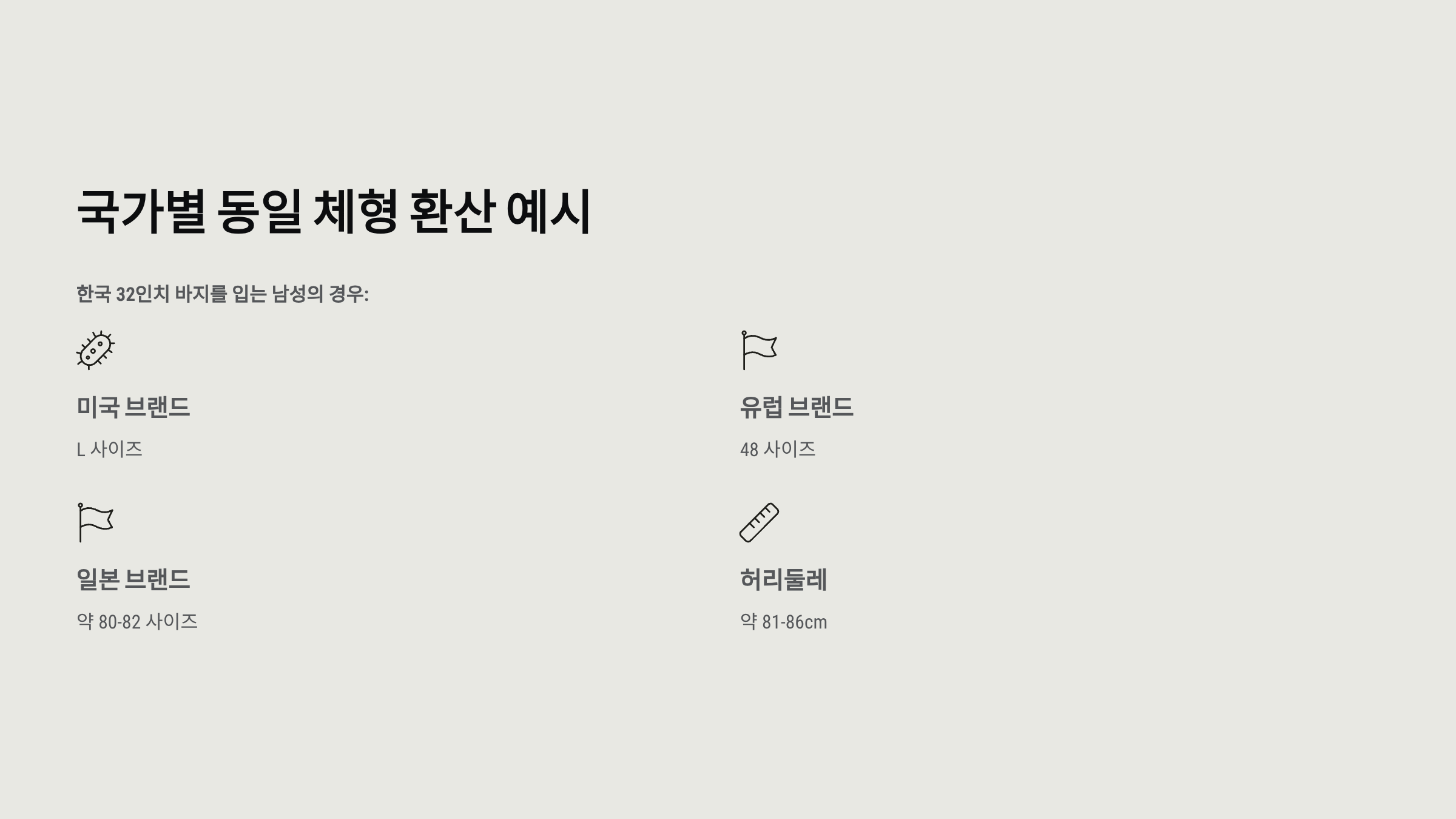 | 한국 | 인치 | 28, 30, 32 | 허리둘레 기준 |