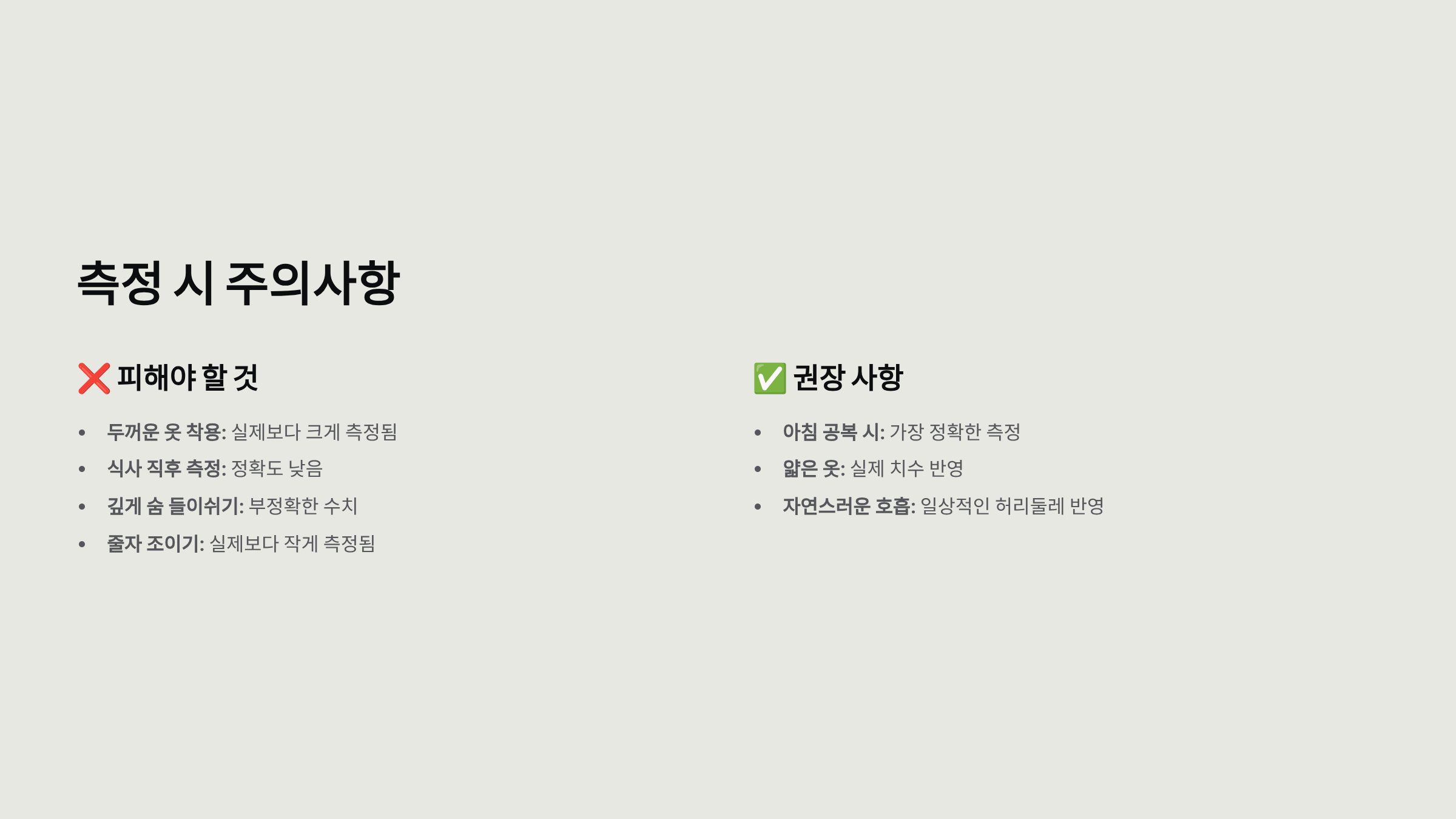 - ❌ 줄자 조이기: 실제보다 작게 측정됨